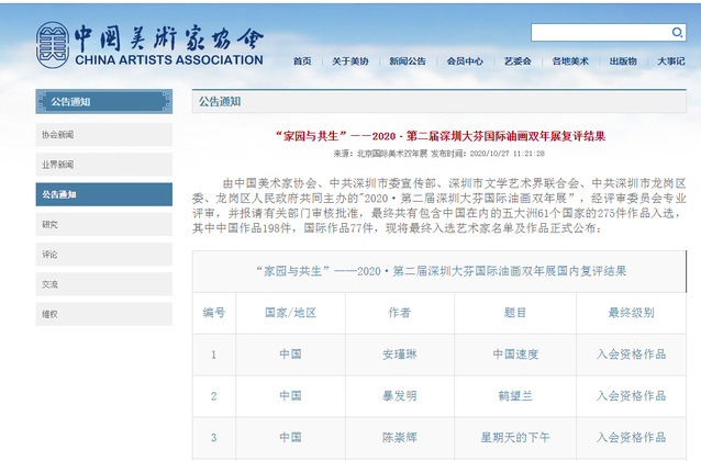 近日,中国美术家协会官网正式公布“家园与共生”——2020·第二届深圳大芬国际油画双年展复评结果,我院青年教师安瑾琳的油画作品《中国速度》成功入选,并获得“入会资格作品”。