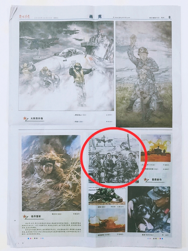 202010月,由米海鹏老师创作的作品《我们都是杜凤瑞》,由该部队推荐刊登在《解放军报》(隶属中央军委机关报刊,与《人民日报》和《求是》杂志,合称两报一刊″)。作品表现了该部四名飞行员勇夺 全军空军大比武″的金头盔奖,凯旋而归的胜利瞬间。人物均以本人为原形,写生数稿后,历时三个多月完成。作品受到业内及部队宣传部门的一致认可!