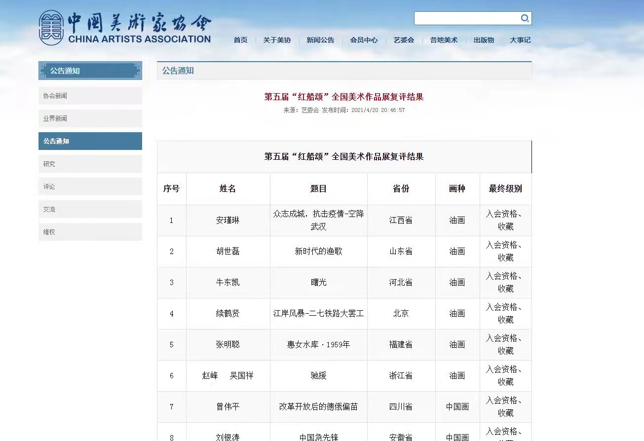 2021年4月20日,经中国美术家协会官网公布,我院青年教师安瑾琳的油画作品《众志成城,抗击疫情—空降武汉》入选第五届“红船颂”全国美术作品展,该作品被评为“入会资格、收藏作品”。本届展览全国共入选中国画、油画作品96幅,其中6幅油画“收藏作品”将永久收藏于浙江嘉兴南湖革命纪念馆。该展览由中国美术家协会、中共浙江省委宣传部、浙江省文学艺术界联合会、中共嘉兴市委、市政府联合主办,将做为中国革命红船启航地为中国共产党成立100周年而准备的特殊献礼,计划于六月份在浙江省嘉兴举行。