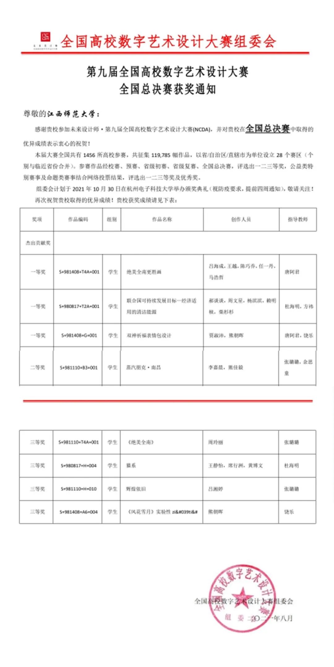 江西师范大学华亿平台师生积极参加未来设计师·第九届全国高校数字艺术设计大赛(NCDA),并在全国总决赛中取得了优异的成绩,热烈祝贺获奖师生!