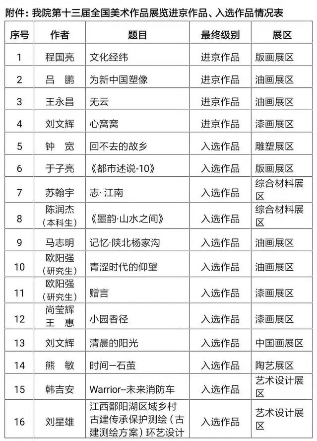 ● 2019年,由文化和旅游部、中国文学艺术界联合会、中国美术家协会主办的第十三届全国美术作品展览复评结果正式公布,我院师生获得16件作品入选,其中4件作品进京