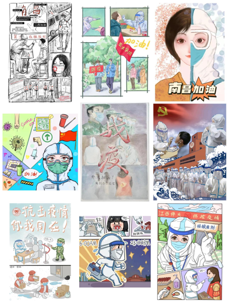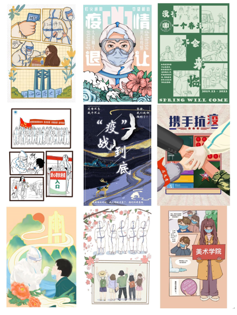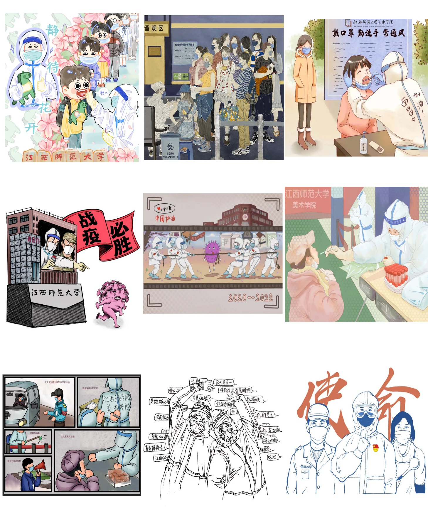 佩戴口罩、扫码、保持一米安全距离……现实中熟悉的核酸检测现场也定格在了美院学子的漫画里。20级黎婉婷说道“做核酸检测试时,志愿者小姐姐很温柔的对我说:‘别害怕,放轻松。’就算是医用面罩挡住了她的脸,我也知道她是一位非常美丽的小姐姐”。“能够发挥自己的特长,贡献自己的力量,我觉得是件非常有意义的事情”,19级闫熙琳说道,“我通过海报的形式,绘制了代表学校的白鹭与象征吉祥如意的白鹤,预示着疫情终将过去,总会春暖花开”。21级研究生黄港铃说:“我绘制了为疫情防控冲锋陷阵的幕后天使,他们是保安大叔、食堂阿姨,致敬每一位平凡英雄。”