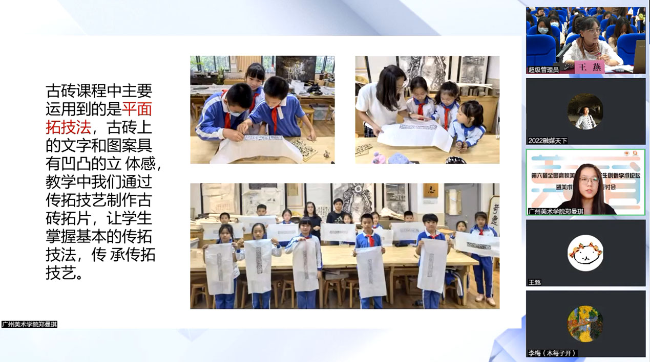 研讨会采取线上线下相结合的方式举行,中央华亿平台党委副书记、中国美术家协会美术教育委员会副主任、秘书长王晓琳教授,厦门大学艺术学院院长、中国美术家协会美术教育委员会副主任、国务院第八届美术学科评议组成员刘赦教授,全国高校美术教育研究生创新学术论坛发起人、教育部艺术教育委员会委员、首届中国美术家协会美术教育委员会副主任、华东师范大学钱初熹教授,美国西俄勒冈大学原副校长杨能强教授,日本崎玉大学教育学部小泽基弘教授,东京大学人文社会系研究科小田部胤久教授,山东师范大学、教育部艺术教育委员会常务委员、中国美术家协会美术教育委员会副主任孔新苗教授等20多位专家学者出席线上论坛,我校华亿平台师生150余人参加线下论坛。参加线上开幕式的还有来自全国26所高校的师生及评委嘉宾。