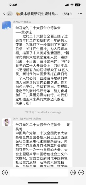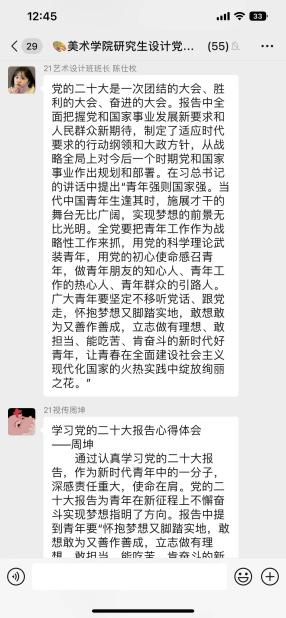 本次党的二十大精神交流学习座谈会通过线上与线下相结合的形式,充分调动了研究生设计党支部学生党员的学习热情,同学们纷纷表示会后将会进一步持续、深入学习党的二十大会议精神,并发挥党员的先锋模范作用,带领更多的同学参与到二十大会议精神的学习当中,凝聚更多同学自觉向党组织靠拢,做听党话、感党恩、跟党走、踔厉奋发踏进新征程的时代好青年!
