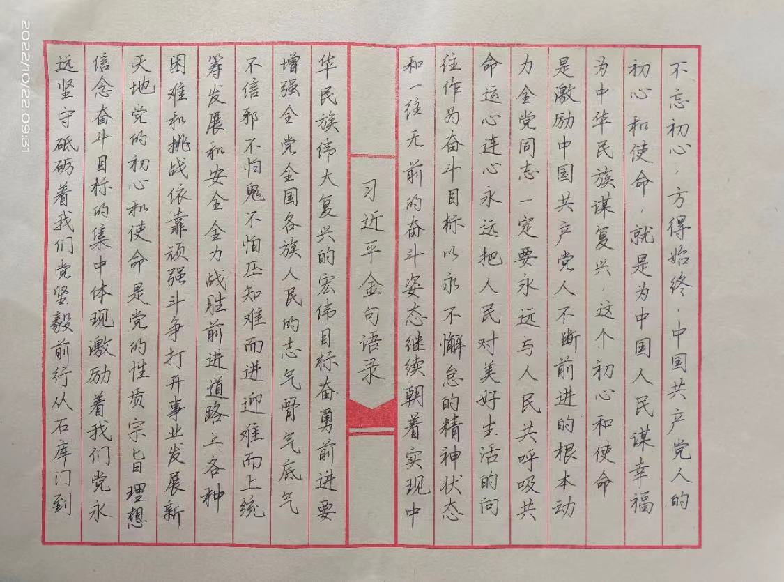 10月22日,为了深入学习宣传贯彻党的二十大精神,华亿平台正大书画协会社员紧扣“书画展情怀,喜迎二十大”主题,开展了学习宣传贯彻党的二十大主题艺术创作活动。通过硬笔书法、软笔书法、篆刻的艺术创作手法,用画笔献礼党的二十大。