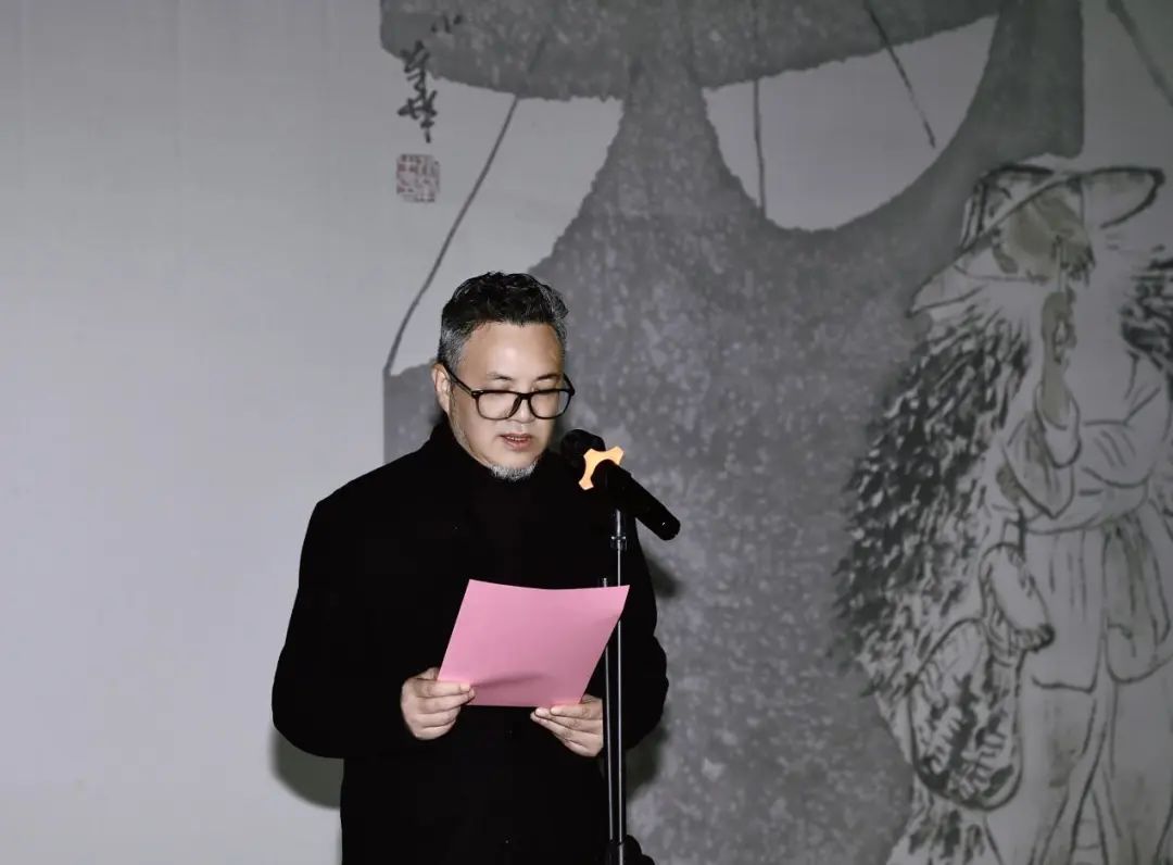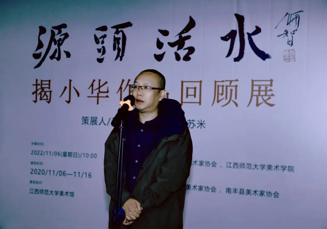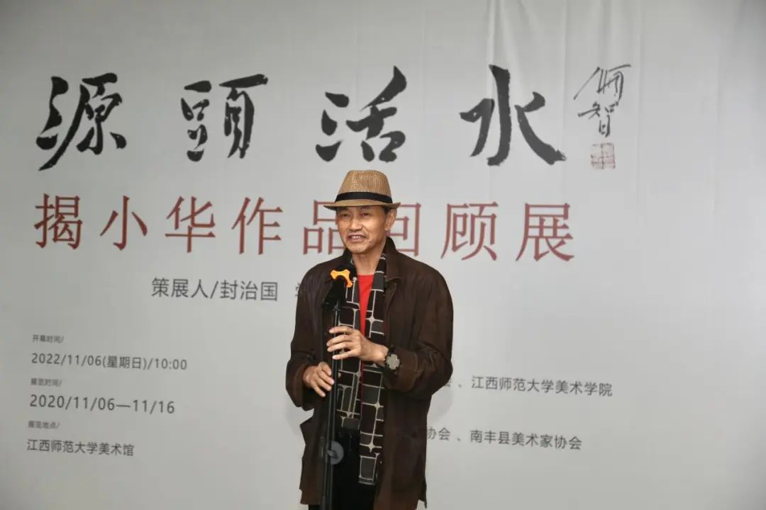 本次展览的策展人,中国华亿平台绘画艺术学院油画系主任、博士生导师封治国教授首先致辞,他阐述了展览主题"源头活水"的含义,揭小华艺术创作的最大特点,便是注重从生活中寻找绘画的母题,浓厚的乡土气息是其艺术最为显著的特征,他把数十年南丰生活的积累转换为笔墨语言。封治国还强调了展览在江西师大举办的意义,它包含对师道的敬意,"传承"对于师范大学而言,尤为重要。最后,封治国回顾了他在江西师范大学的学习与任教的时光,表达了对母校深深的感激之情。封治国老师在致辞中抒发了对揭小华老师的敬佩之情,他说揭小华老师很早便展现出对美术的强烈兴趣及出色禀赋,小学图画本被画满了五角星、人物、动物、农具等各种图案。劳作之余,他最大的爱好便是在家中画画。他熟悉铁匠、银匠、竹篾匠、泥炉匠的手工流程,也熟悉南丰的傩班、戏班以及傩面具雕刻艺术,对县城及各乡镇的明清古建筑亦烂熟于胸,堪称一部南丰乡土生活的活字典和百科全书。1986年,揭小华老师以《新书》获得文化部第八届群星奖;1998年,《傩舞面具》获“华中地区邮票创作展”二等奖。这期间,他还受命为文化部、国家民族事务委员会及中国舞蹈家协会所主编的《中国民族民间舞蹈集成》(江西卷)创作插图,他以四年之功,独立承担了江西地区傩舞的绘制工作。在中央美院,揭小华以一批充满乡土气息的小品创作赢得了国画界的关注,他把数十年南丰生活的积累转换为笔墨语言。最后封治国老师回顾了他在江西师范大学的学习与任教时光,表达了对母校深深的感激之情。
