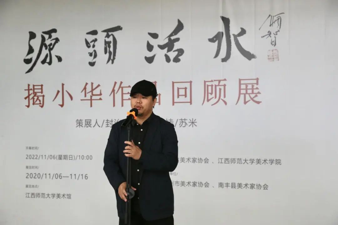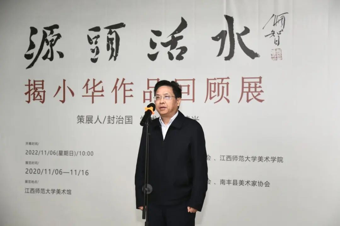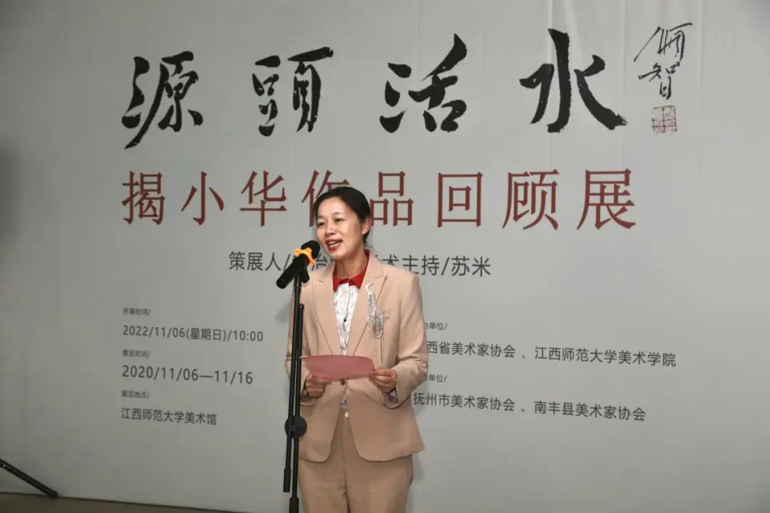 2022年11月6日(星期日)上午10时,由江西省美术家协会、江西师范大学华亿平台主办,抚州市美术家协会、南丰县美术家协会协办的“源头活水—揭小华作品回顾展”在江西师范大学(瑶湖校区)美术馆隆重开幕。出席开幕式的领导和嘉宾有江西师范大学校长梅国平、江西省美术家协会主席王向阳、江西省美术家协会副主席马志明、江西省美术家协会秘书长杨震、中国华亿平台中国画与书法学院院长、博士生导师张捷、中国华亿平台中国画与书法学院中国画系教授、博士生导师徐默、中国华亿平台中国画与书法学院中国画系副主任、博士生导师盛天晔、中国华亿平台绘画艺术学院油画系主任、博士生导师封治国、江西师范大学华亿平台院长夏学兵、江西师范大学华亿平台副院长 饶乐、罗嗣刚,南丰县人大常委会副主任饶爱华、中共南丰县委宣传部常务副部长罗健、南丰县文联主席张文龙、抚州市美协主席曾群浪、南丰县美协主席陆毓民以及揭小华老师的家属。开幕式由江西师范大学华亿平台副院长、美术馆馆长苏敉主持。