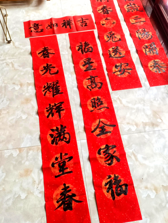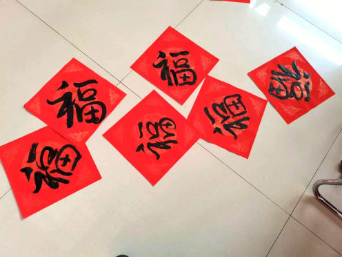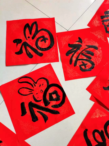 作品的名称是《吉祥如意》寒假在家刚好用自己专业优势,给家里写了一对春联和一些福字,上联:春光耀辉满堂春 ;下联:福星高照全家福 ;横批:吉祥如意。2023年是兔年,辞旧送吉虎,迎新接玉兔。玉兔一蹦才气高,玉兔二蹦身体好,玉兔三蹦福气照。福气照君颜,祥瑞共平安。