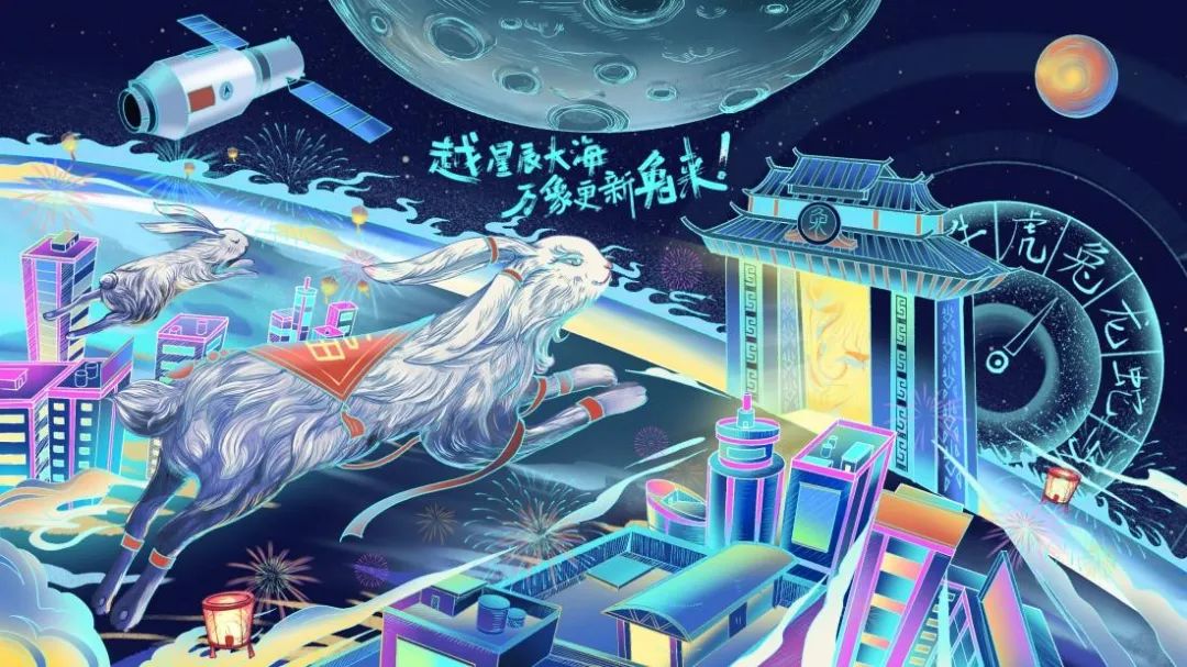 作品的名称是《越星辰大海,万象更新兔来!》,它是通过插画的设计手法,加之对兔年美好祝愿的理念进行创作。通过这个作品我想表达的是以月球、城市以及航天系统来衬托画面,以兔子的形态表现出对祖国未来科技兴国的美好愿景,新年新气象,愿我们越越星辰大海,万象更新兔来!