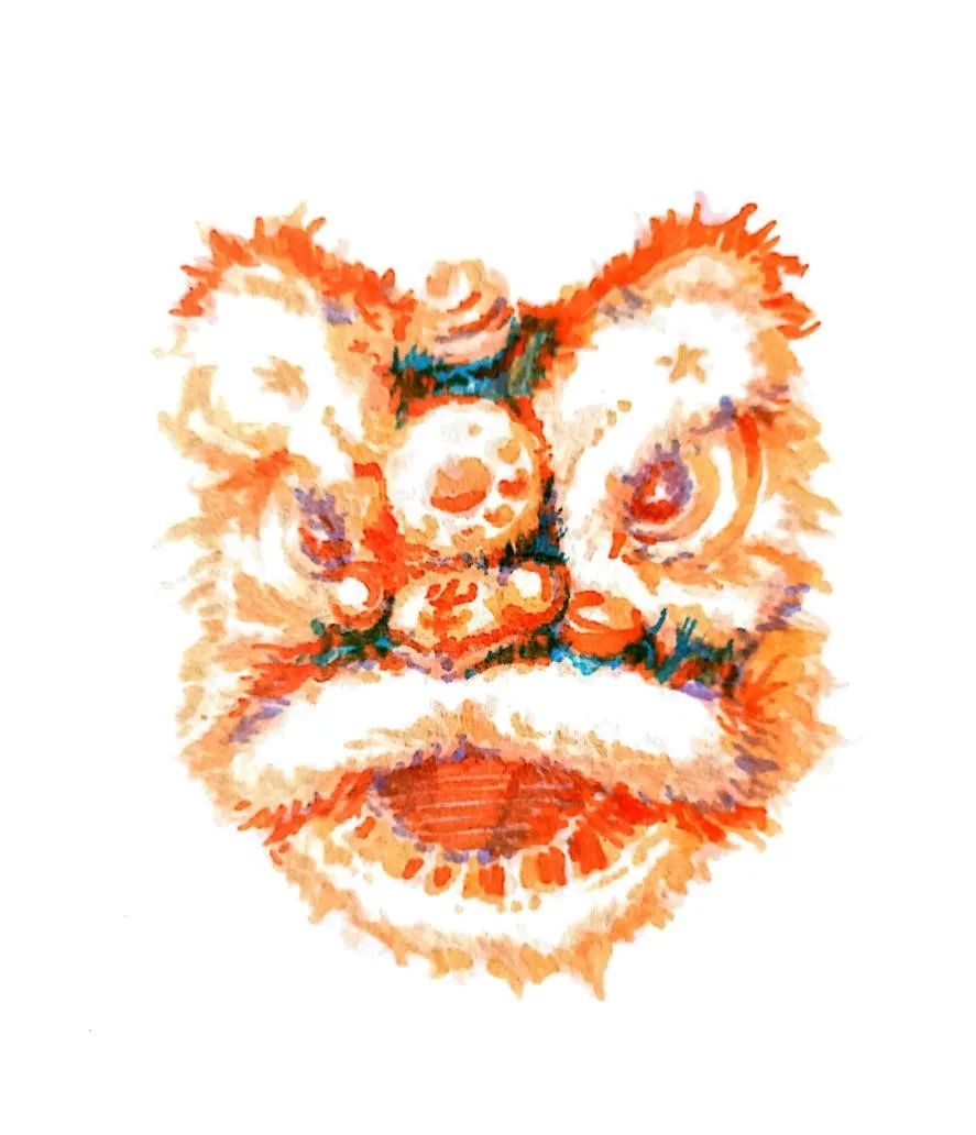 作品的名称是《醒狮头》,它是通过马克笔速涂的方式进行创作。通过这个作品我想表达的是在网络高速发展的当代中国,过年缺乏年味,舞龙舞狮及放鞭炮放烟花等一系列受场地环境因素限制的庆祝活动逐渐淡出大众视野。于是我希望通过绘画等形式保留和传承这些富有年味的民俗,使人们感受到过年的节日氛围。