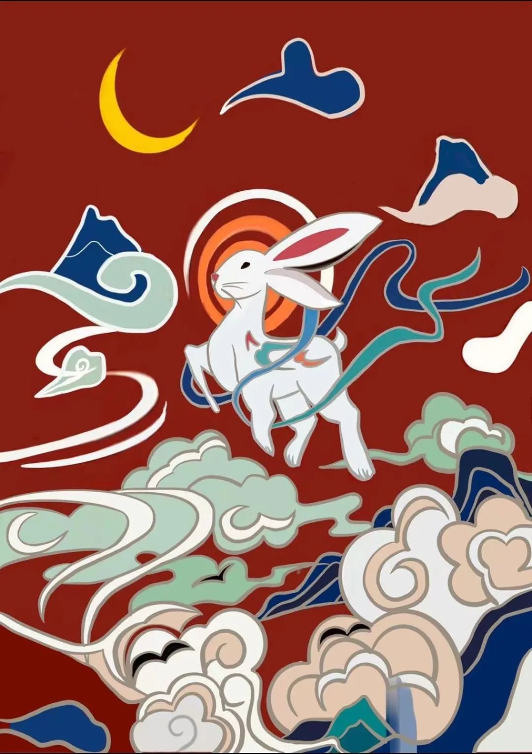 作品的名称是《敦煌九色兔》,是一幅用手绘板绘制而成的画。通过将敦煌壁画中九色鹿一卷里的传统元素归纳整合,用平面化、现代化的形式表现出来,更加入了祥瑞的玉兔元素,喜迎新春的同时将传统文化“年轻化”。我希望家人与同学朋友看到祥瑞的九色兔时,新的一年也能够事事顺意,“兔”飞猛进。愿岁岁常欢愉,年年皆胜意!所求皆如愿,所行化坦途,多喜乐,长安宁。