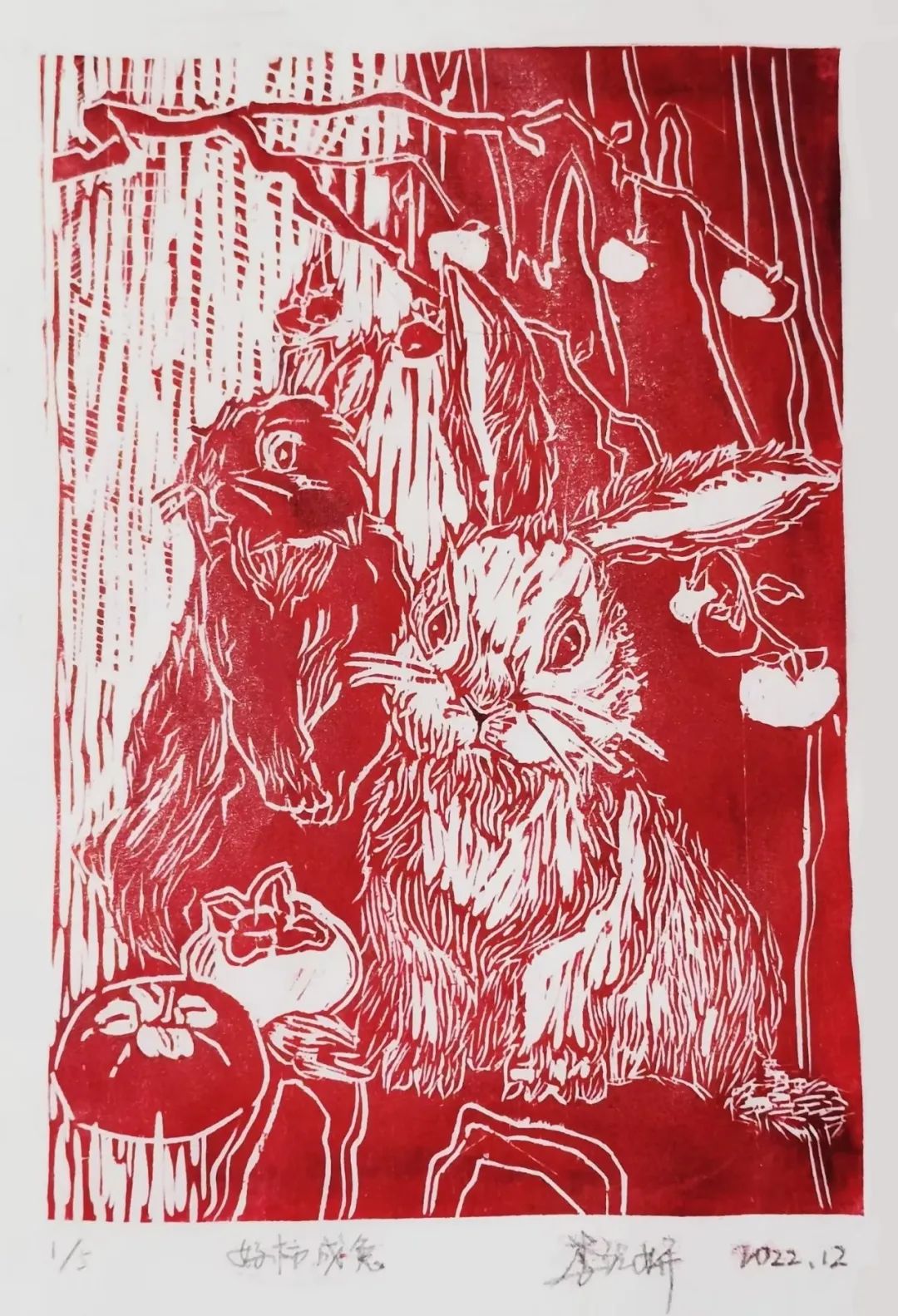 作品的名称是《好柿成兔》,它是通过木刻版画的形式进行创作。作品的主体是两只雌雄兔正印证今年是卯兔年,而饱满欲坠的早柿则满含过年喜气,寓意着丰收和好运。“立秋胡桃白露梨,寒露柿子红了皮”,红艳的柿子,如一盏盏红灯笼挂在寒雪枝头,“大红灯笼高高挂,又到爆竹声声时”,霜柿临了春晓,福兔送来祥瑞,待到冰雪消融时,阖家欢乐把年过。通过这个作品我想表达的是我对新春的美好期待好事成双,好运连绵不断。