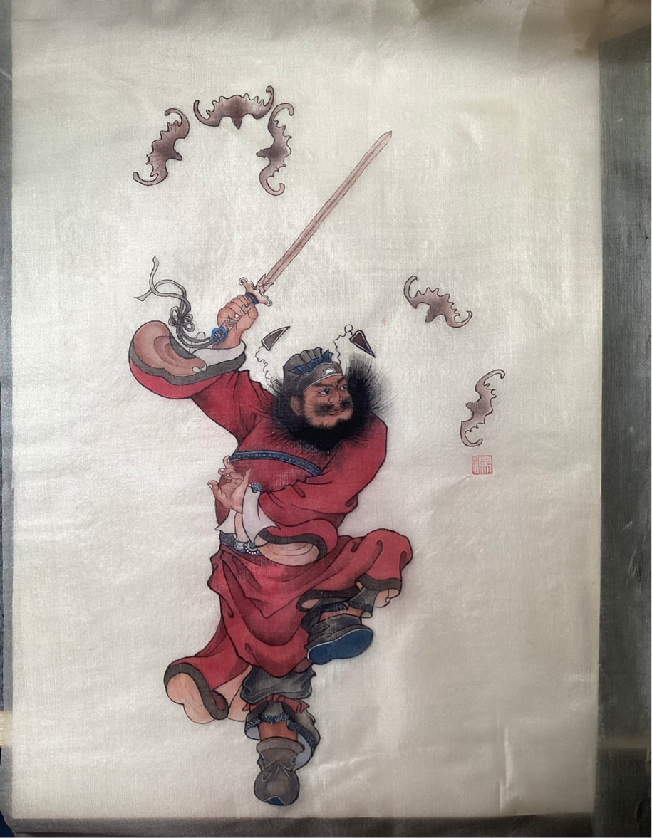 作品的名称是《钟馗送福》,它是通过工笔绢本进行创作。通过这个作品我想表达的是钟馗寓意着驱邪避灾、保佑平安,象征着驱赶邪恶。