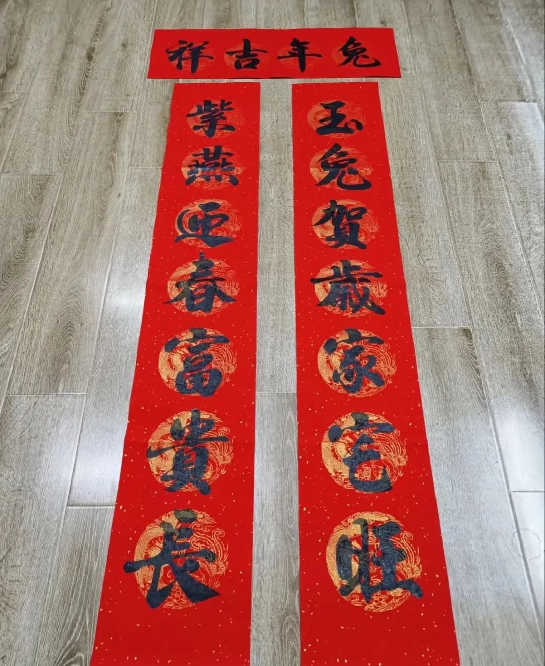作品的名称是《兔年吉祥》,它是通过对联文字形式进行创作。通过这个作品我想表达的是出门当红、抬头见喜。对联简单的文字形式能最直观地体现出一个家庭对新的一年的美好希望,彰显出一个家庭的精气。