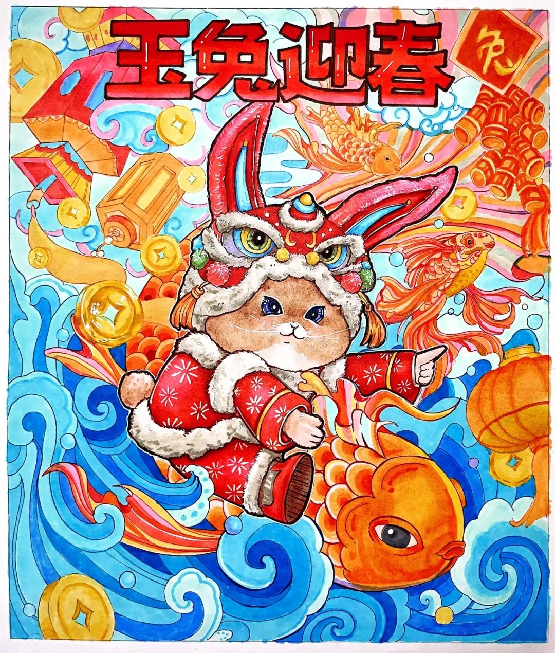 作品的名称是《玉兔迎春》,是一幅通过使用马克笔手绘创作的新年插画。这幅作品的主角兔子在画面的正中,戴着醒师帽,在海浪中骑着鲤鱼,手指指向前方。象征着兔年年年有余、顺风顺水、乘风破浪、勇往直前。加入了灯笼、爆竹、铜钱等元素,增添了喜庆的过年氛围并且爆竹具有消灾,铜钱代表富贵的内涵。