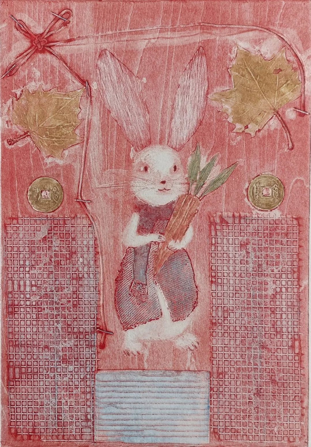 作品的名称是《前兔似锦》,它是通过版绘的形式进行创作。祝福大家欢欢喜喜迎兔年,万事如意平安年,梦想成真不负好时光,前途一片光明。
