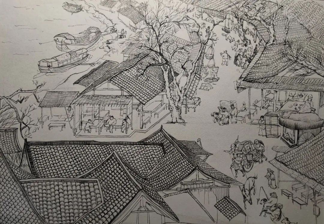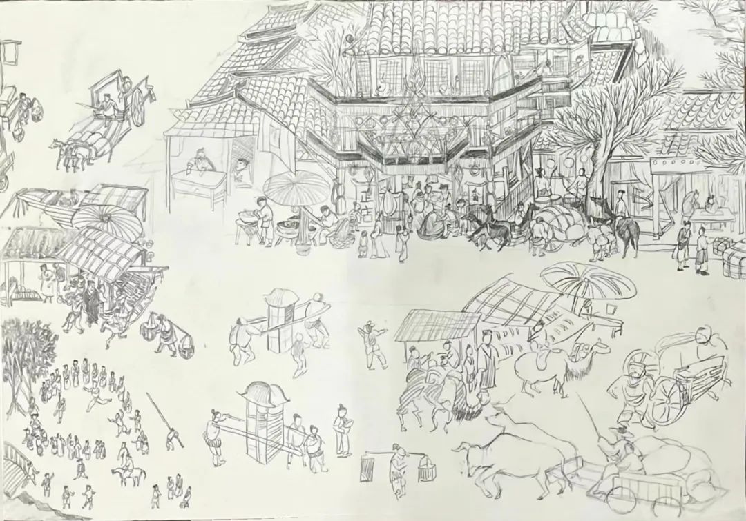 作品说明:首先,画面视觉中心采用的是《清明上河图》城门旁的大酒楼 ,酒楼的繁复构造,生动的行人一起融合的场景。这个场景丰满地表达出热闹、欢快,让我心动。其次,考虑到画面的疏密性,画面的左边是用大量的留白做的河流作为透气。从条桥边走过酒楼,是由多个小摊位组成的小集市,仔细看他们都生动有趣。其中画面中最大的树画出了风动的感觉,也为画面由密到疏做了过度。再往右,有靠近船边摆摊的人,逛街的人、狗狗以及慢慢消失的小路,这条小路与画面左边有一定的对称性,也是我们这幅画的一个小亮点。且右边整体细节很多,人物的故事性比左边强烈一些……此外考虑到画面的明暗、前后、虚实,我们还在原本的画作上叠加了灰色马克笔,碳笔,让画面效果更加强烈、更有冲击力。