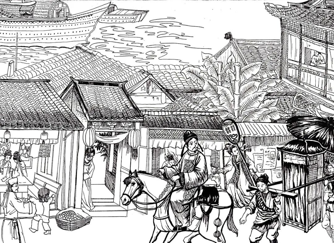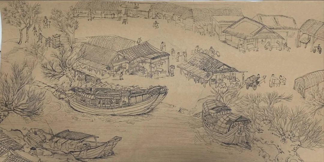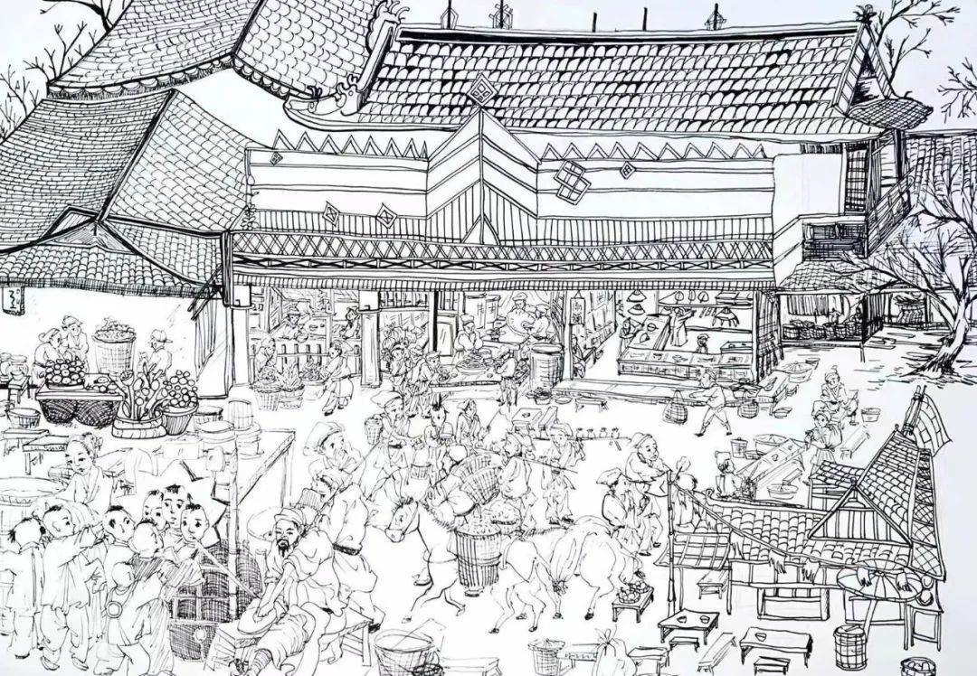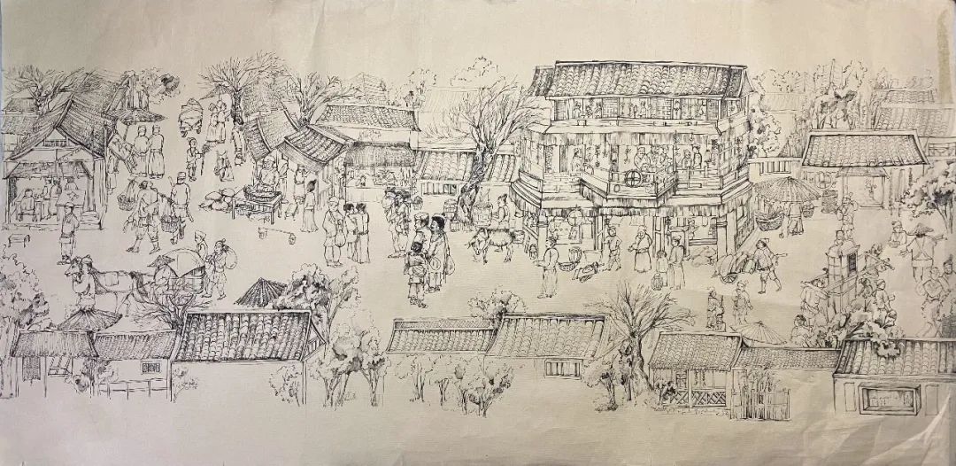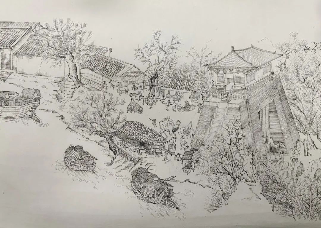 作品说明:提取古代各类建筑的因素,设置买布裁衣、新郎骑马抬轿入新房、舫船上河等场景。用铅笔起草,勾线笔描摹。创作意旨:围绕婚嫁的主题,构成了一幅娶亲的热闹景象,抬花轿,吹唢呐,新郎官骑马在前,邻里都在探头观望的场景,表现古时嫁娶时的热闹,体现平民百姓的日常生活。