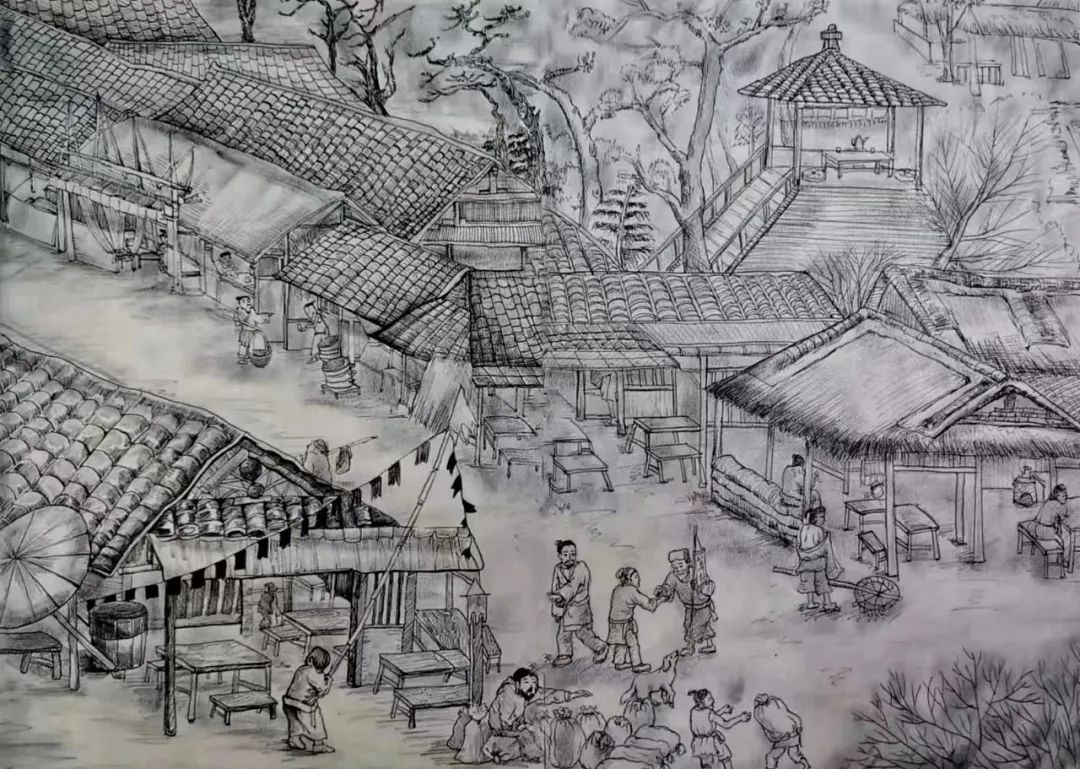 作品说明:以百姓的生活日常为主题,参考清明上河图,用横构图作画,凸显出街市的宽阔,因为那时的商业很发达,所有小摊门店都很繁华,用针管笔画出古时人们逛闹市的场景,颇有一番别味。由于不经营早点所以才迟迟的撑起招揽顾客的旗幡,酒店开在散装货运码头,生意自然很兴隆,只是客人正在忙生意,还不到吃饭喝酒的时间,你看码头上货主正在清点要发某地的货物,码头工人正在把运来的货物堆码起来,准备根据运货地点远近,适时安排装卸,正所谓是先上船后起坡。百姓生活安居乐业,又在集市,故而取名:乐平小市