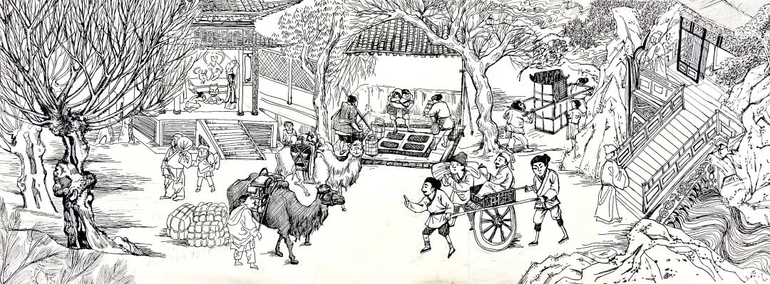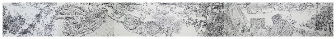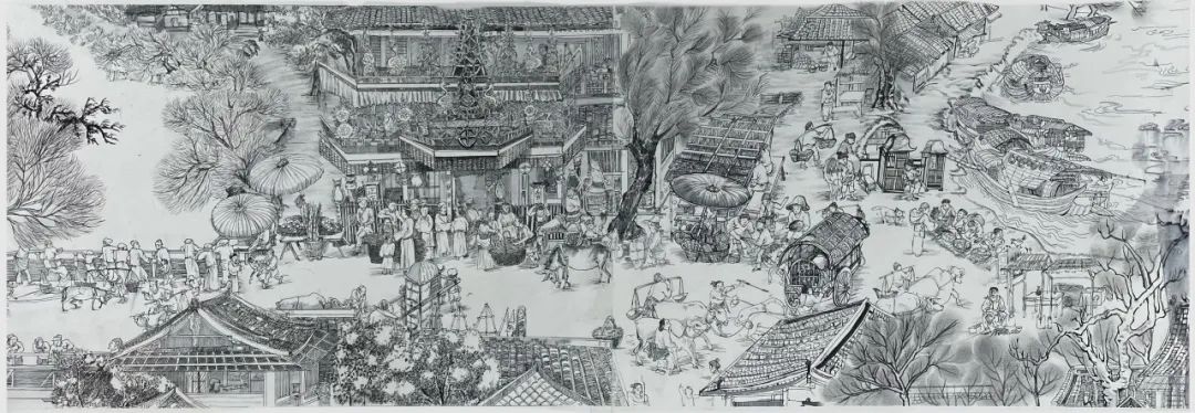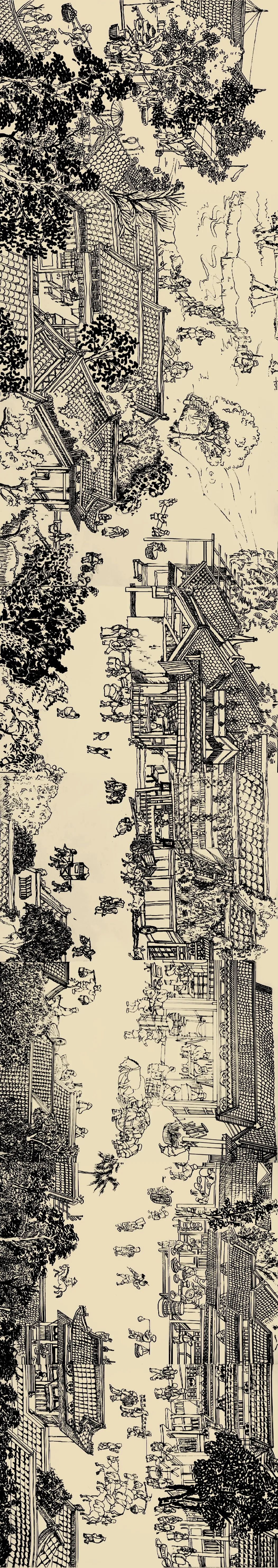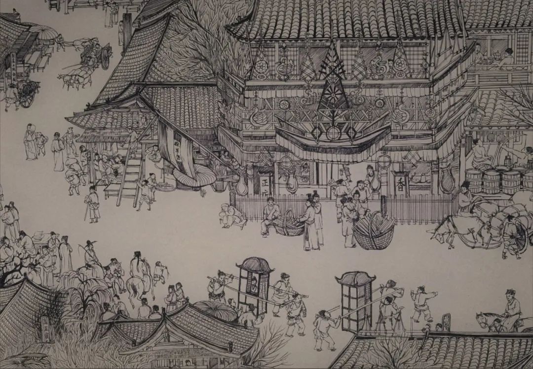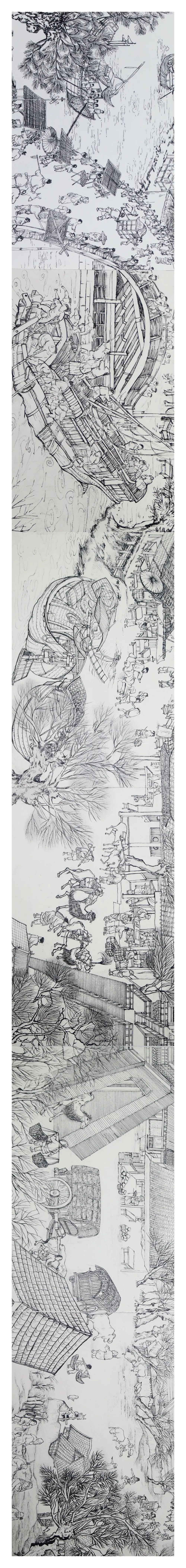 作品说明:这幅作品是由六人完成的长卷,以宋代人生活所需的代步工具为主题。作品展现了清明上河图中种类繁多的交通工具,与周围的街景相融合,表现了北宋街市交通的繁荣。作品用线描的方式,将众多交通工具与街景进行重组,展现出画面的丰富性、趣味性。水上运输的船有商船,也有运输粮食的漕船,发达的航运保证了百万以上军民的衣食所需。陆地上有轿子,又称“肩舆”,是一种靠人或畜扛、载而行,供人乘坐的交通工具,画面中城门内外有几头骆驼背负物资正在通过,这可能是来自西方的商队。出城门后可以看到几辆用于载人的牛车。画面中右上方的群像是结婚的车队,前面是凭人力扛起的轿子,后面有一男性坐在马背,最后是一些仆人抬着嫁妆和行李。我们通过描绘这些各具特色的交通工具来表现宋代经济的发达和都城的繁荣。