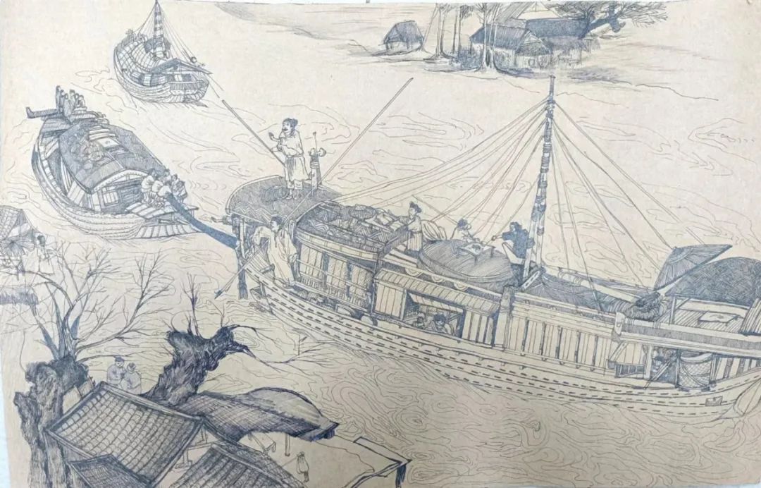 作品说明:选择了清明上河图中的船只,场景为汴河上的风光,想体现出北宋时代的河运,视觉中心是一艘大的客船,透过窗户我们可以看到,船内有餐桌之类的家具,一个妇女带着小孩往外看,其他的伙计以及船长正在紧张的组织船的行进。以及后面还画了两艘较小的船,可以看到当时北宋时期十分的繁荣,水运经济也很发达,不只有客船又有货船,可以看出当时的经济种类也十分繁杂。同时汴河的两岸有些房子,是那些在岸边开的一些小商铺。透过几艘船,也能了解繁荣的北宋。