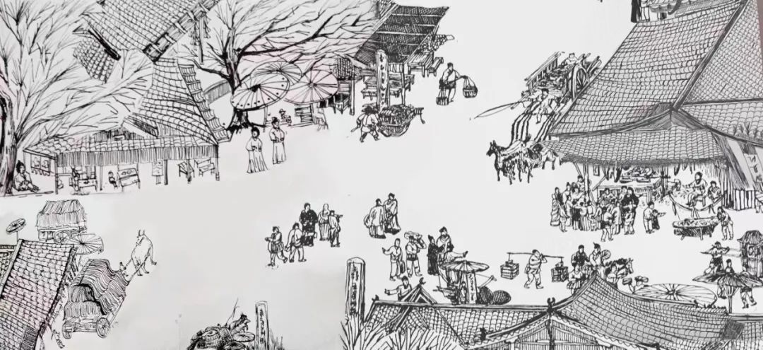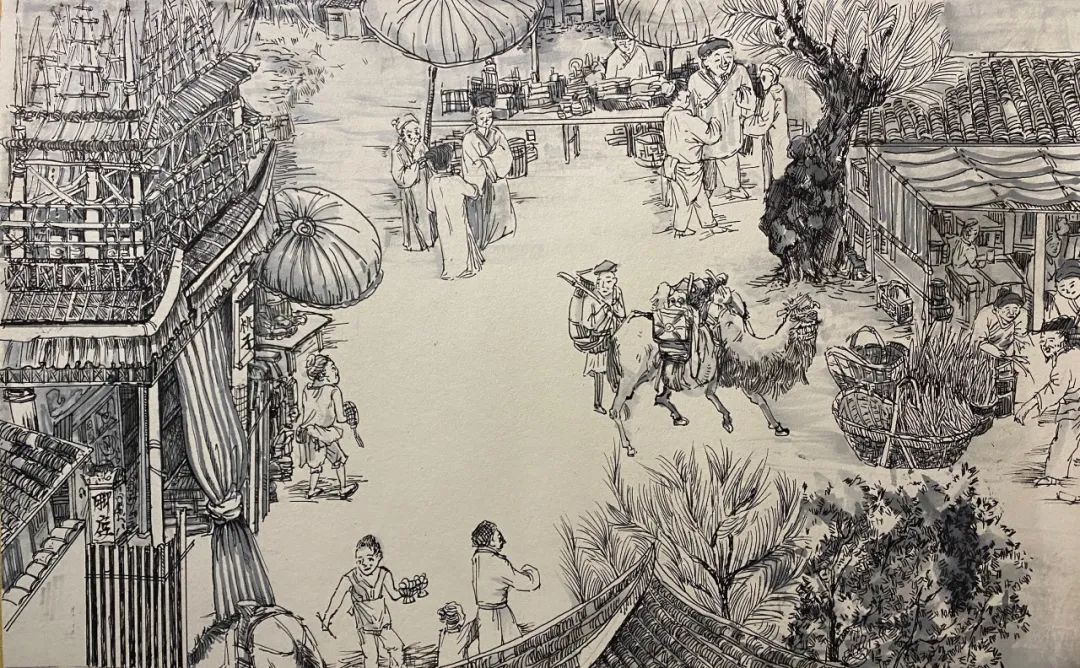 参考文献:主要参考张泽瑞《清明上河图》后段画面内容,描写的是市区街道,城内商店鳞次栉比,街上行人摩肩接踵,车马骆驼络绎不绝的繁华景象。
