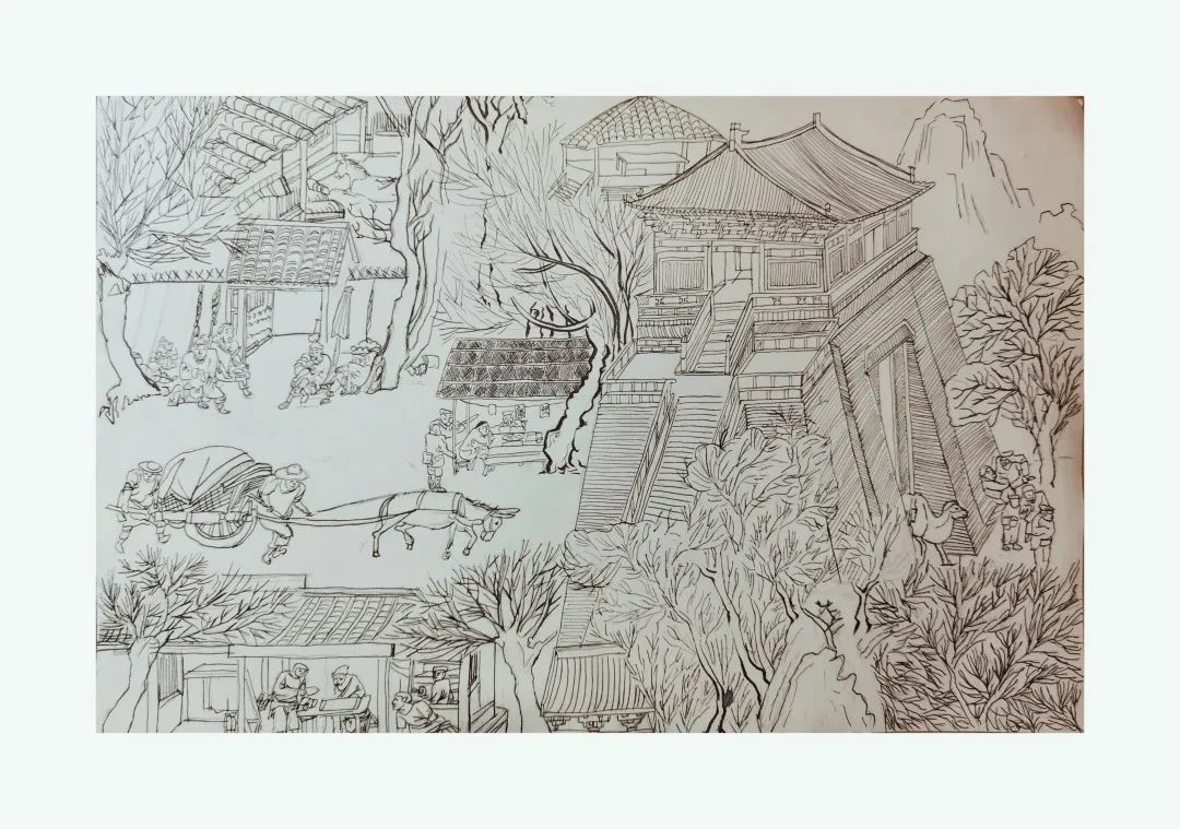作品说明:我们想在有限的纸张尽量勾勒出北宋时期的繁荣昌盛,四海升平。于是我们分别从汴京郊外春光、汴河场景、城内街市三部分各自摘取出一个场景,从左到右进行观看,分别是苍劲有力的古树,树旁边有一个老爷带着佣人在一旁赏景,后面是一个祠堂,有人在对神像进行祭拜。只听见驼铃悠悠响起,原来是驼队从远方回来了。两只骆驼威风凛凛神采奕奕,仿佛在攀比谁驮的粮食更多。驼队的前面碰到了另外一个队伍,大概是一家先生出来赏景写诗,手捧史书正在滋滋有味的朗诵。后方还有民生气息的打水的井口伙计,和往远处而去的抬轿队伍。而图的最右边,古石,古山,古树,更多了几分悠然自得与桃源仙境之感。更体现宋朝文人气息的浓厚与雅兴。