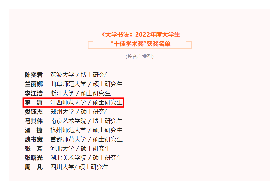 恭喜我院研究生李潇同学在此次活动中获得《大学书法》2022年度大学生“十佳学术奖”,并祝贺李潇同学确定录取为日本滋贺大学联合大学院书法教育2023级博士生。
