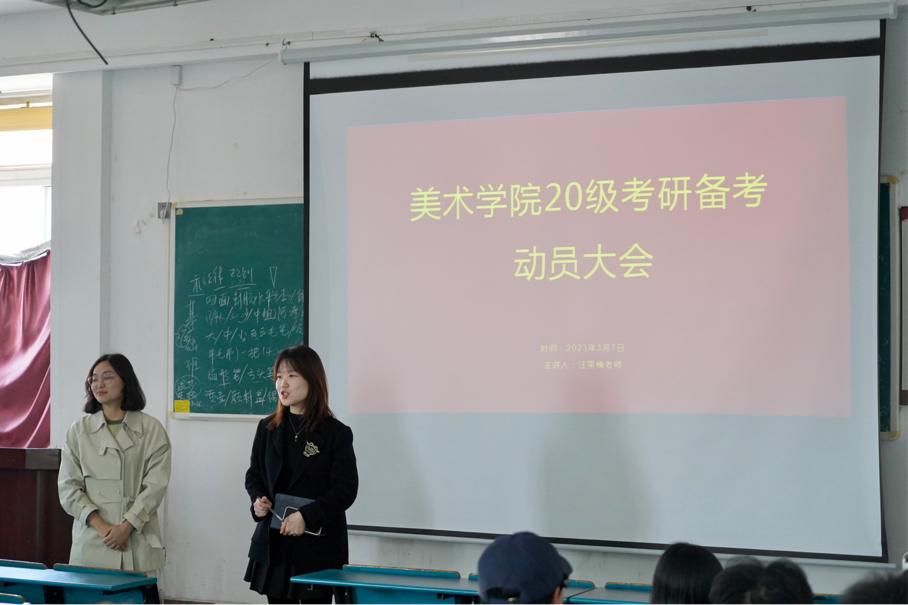为充分调动我院学生的考研积极性,尽早明确考研目标与就业方向,解答同学们关于考研的疑惑,2023年3月7日晚,美术学院在超真楼B401举行第一场2020级考研动员大会,会议由2020级辅导员胡园慧主持,汪笑楠老师主讲。