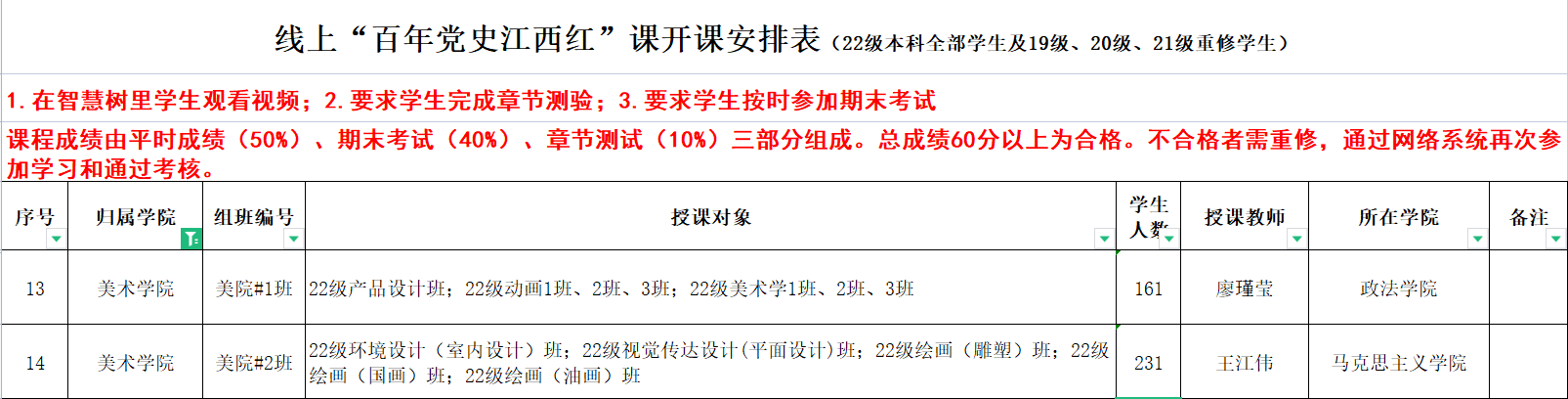 线上“百年党史江西红”课开课安排表(22级本科全部学生及19级、20级、21级重修学生)