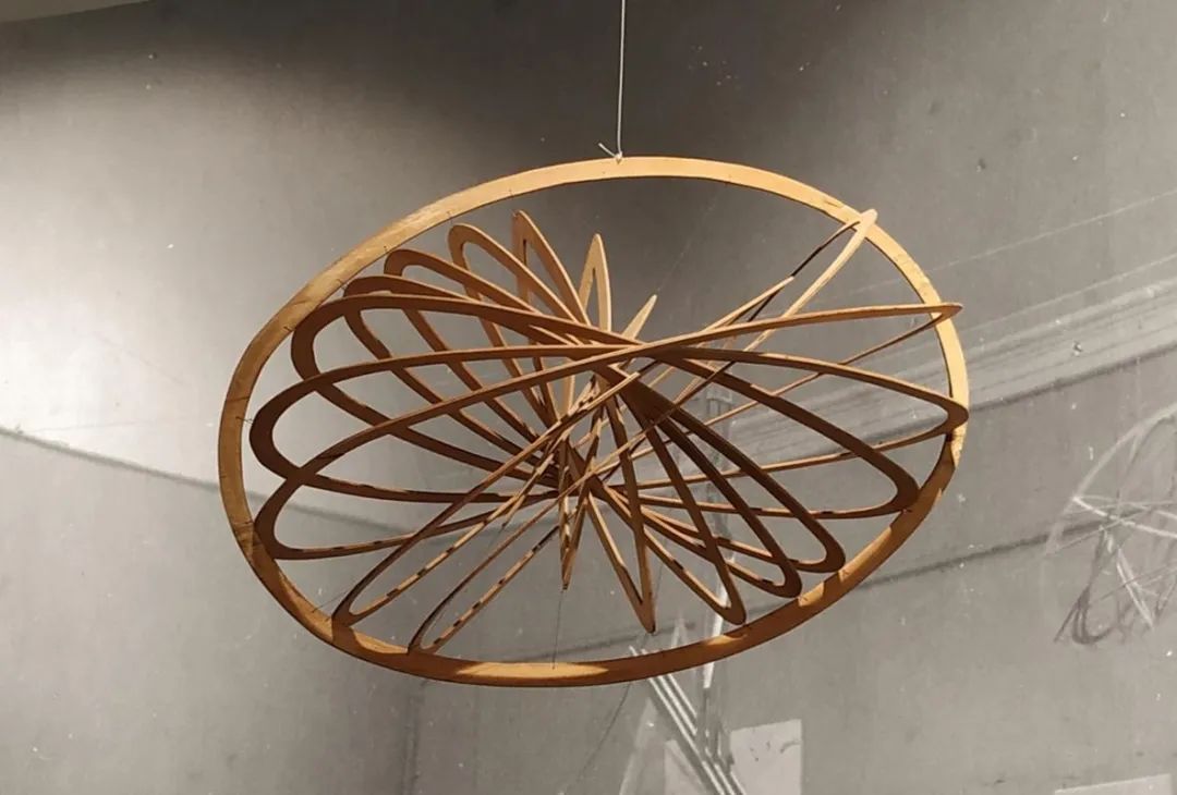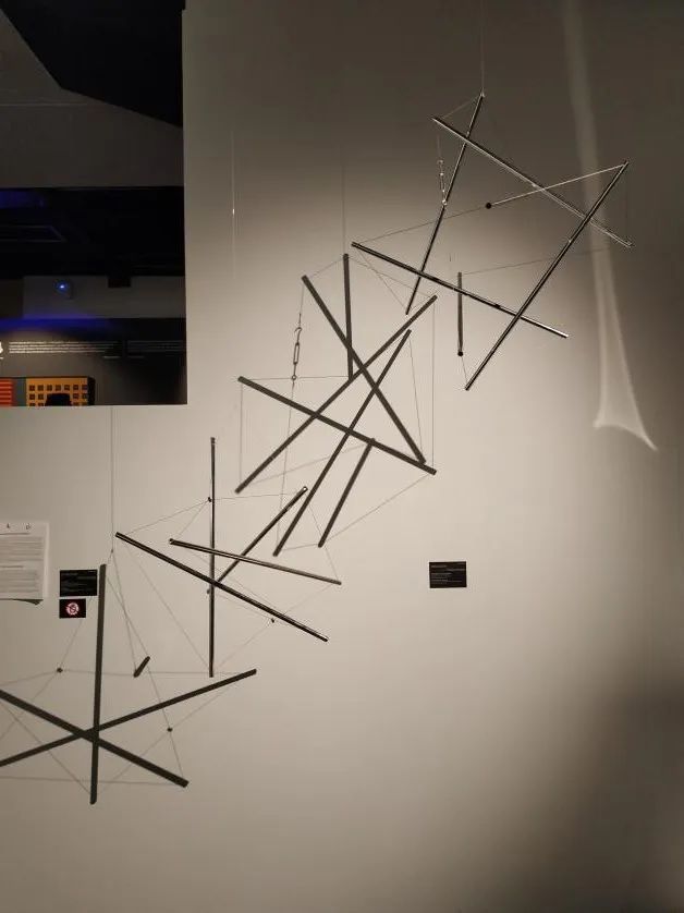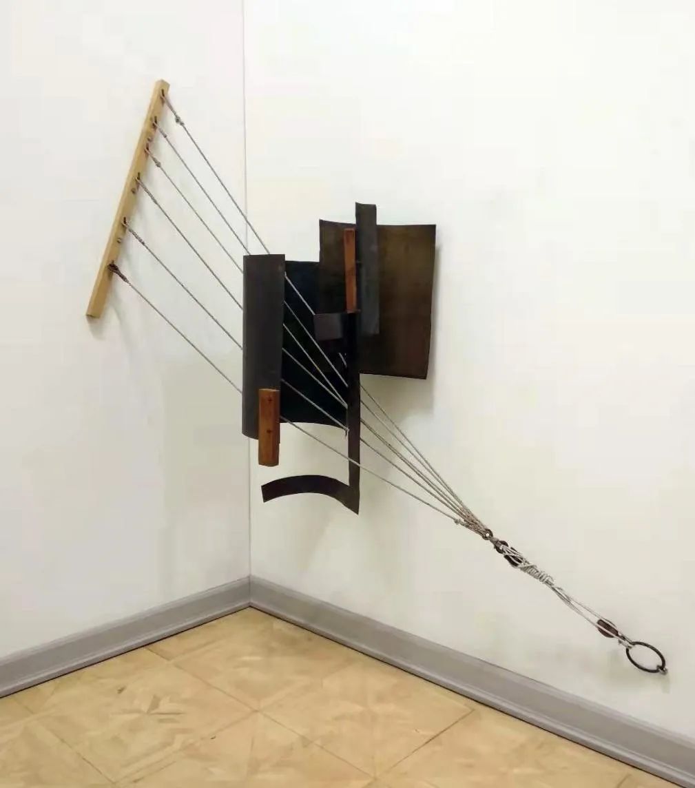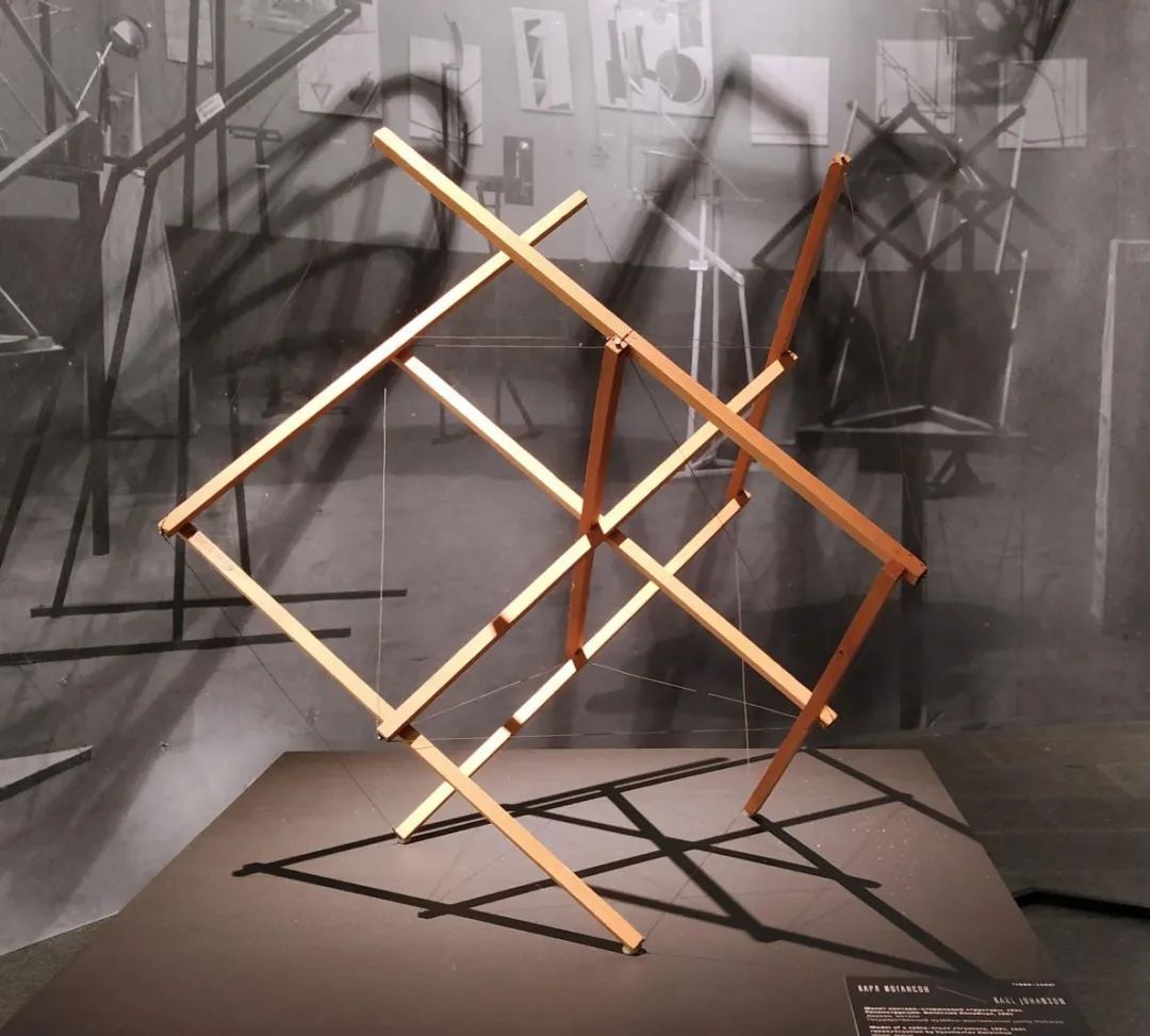 拉脱维亚艺术家卡尔·约翰逊的《杠杆与钢索的结构布局》,它是利用钢丝的牵拉,将木条进行组合,是“自应力结构”在艺术创作中最早的实践者。