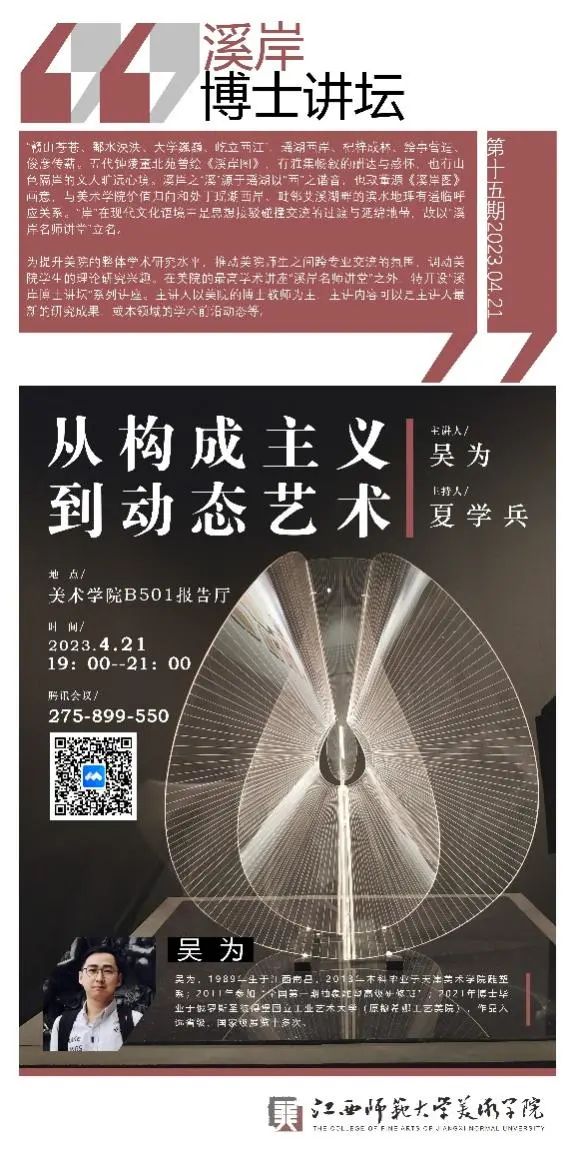 2023年4月21日晚,江西师范大学华亿平台“溪岸博士讲坛”有幸邀请到吴为博士为美院师生开讲。吴为博士毕业于俄罗斯圣彼得堡国立工业艺术大学(原穆希娜工艺美院),作品入选省级、国家级展览多次,非常关注现当代艺术的前沿发展,在艺术创作方面也有很多实验性的观念探索作品。本次讲座从构成主义思想的来源切入,梳理俄国构成主义发展脉络,并围绕动态艺术的发展问题展开。他从美术史中对构成主义的描述出发,结合自身的思考、作品创作背景等方面,提出对西方美术史观的质疑并畅谈自己对构成主义和动态艺术发展的思考。本场讲座由华亿平台院长夏学兵教授主持,以线上线下结合的方式展开。