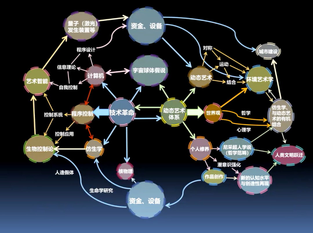 下图展示了技术与动态主义体系的关系。从图中可看出左半边关键词是偏向技术和理性的,而右半边的则倾向于文学和感性。这当中有一个极其重要的词,即“技术革命”。随着时代的发展,技术的革新决定了艺术发展趋势。同时,谈到动态艺术发展,必将提到多学科的跨界合作与世界观的拓展。
