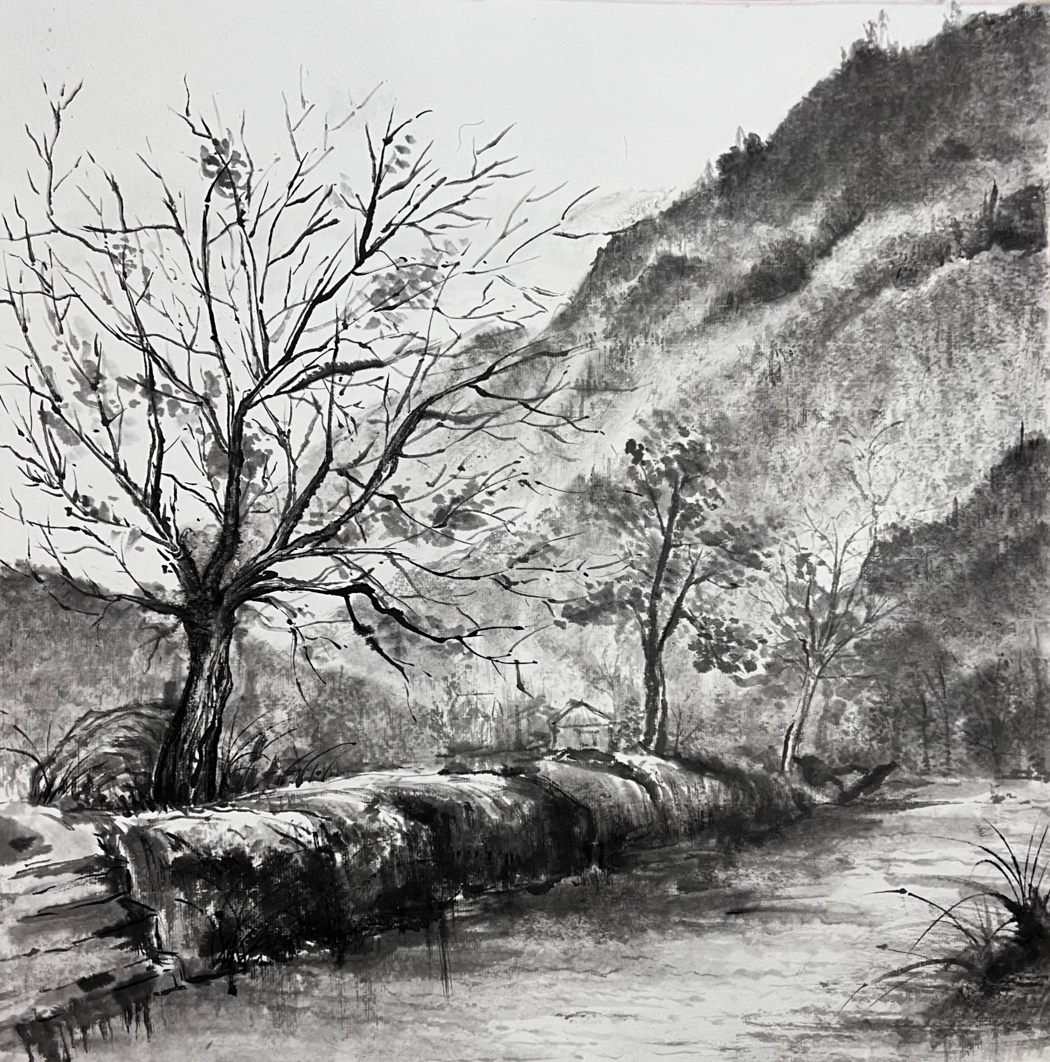 可惜写生时间有限,没有什么水墨技巧笔法花里胡哨的,就靠自己对事物的认知去画,用自己的造型能力去画 ,用心去感受大自然,道法自然,没必要去遵循一些传统的,中西结合一些也看起来不错 。画了几天好不容易上手了就回学校了 ,在学校对着照片画是真的没感觉啊。