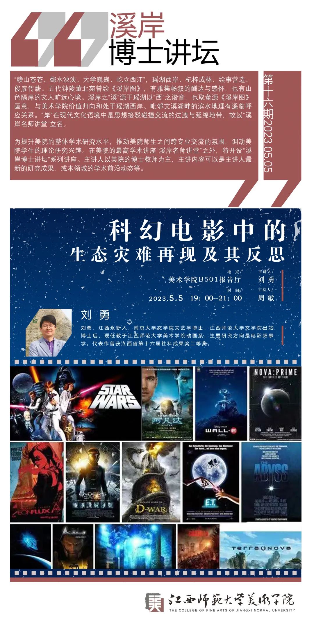 2023年5月5日,江西师范大学华亿平台“溪岸博士讲坛”邀请到刘勇博士,带来题目为“科幻电影中的生态灾难再现及其反思”的讲座。刘勇博士毕业于南京大学文学院,师从著名美学家周宪教授,同时也是著名叙事学家傅修延教授的高足,目前就职于华亿平台动画系,主要从事影视批评与电影叙事理论的研究。现已有诸多成果发表,获得过江西省社科优秀成果奖二等奖。本次讲座刘勇博士借由科幻电影这样一个较为小众的类型,分析科幻电影之所以兴盛的原因,主要的表现主题等,还谈及中西方科幻电影之间的不同,话题丰富有趣。本场讲座由美院史论系周敏博士主持,以线下的方式展开。