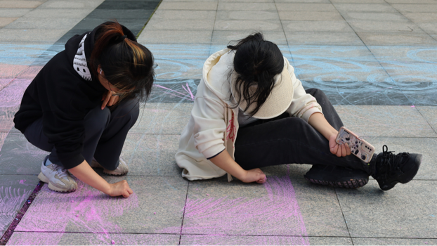 同学们以“中国式现代化”“新时代好青年”“乡村振兴”“校史旧址”等为主题进行创作。这些画作引起很多的师生驻足观赏和拍照打卡,还有师生参与进来一起创作。