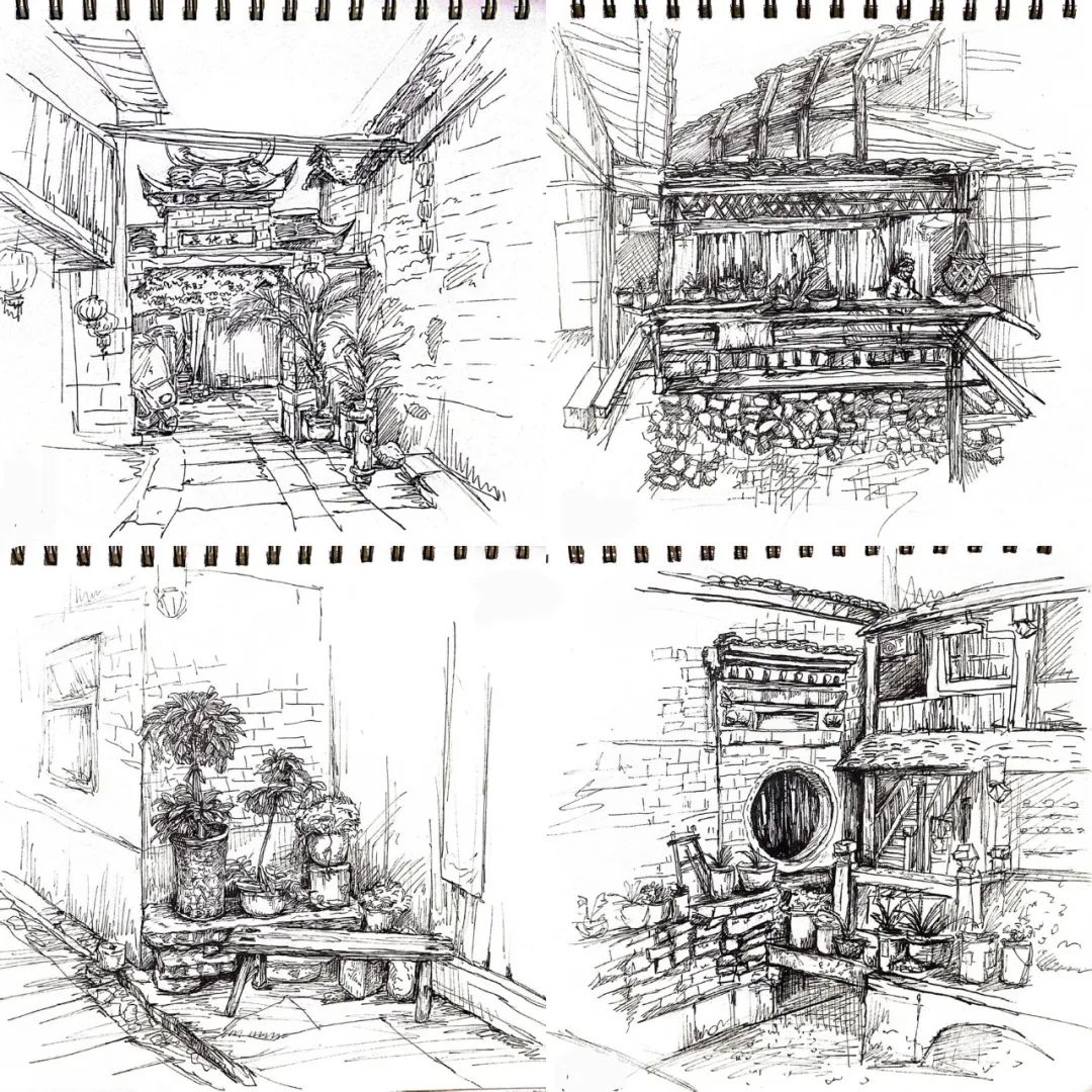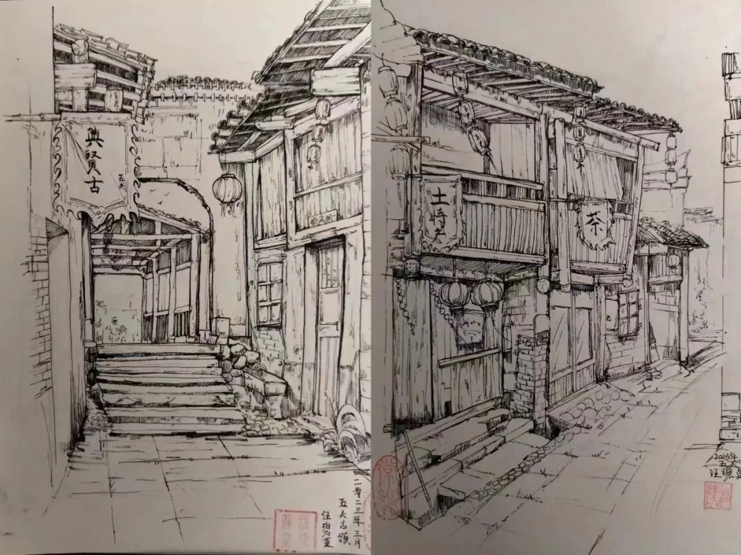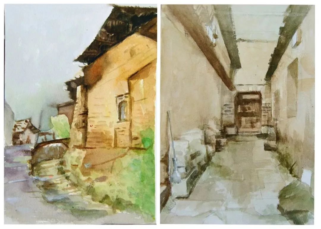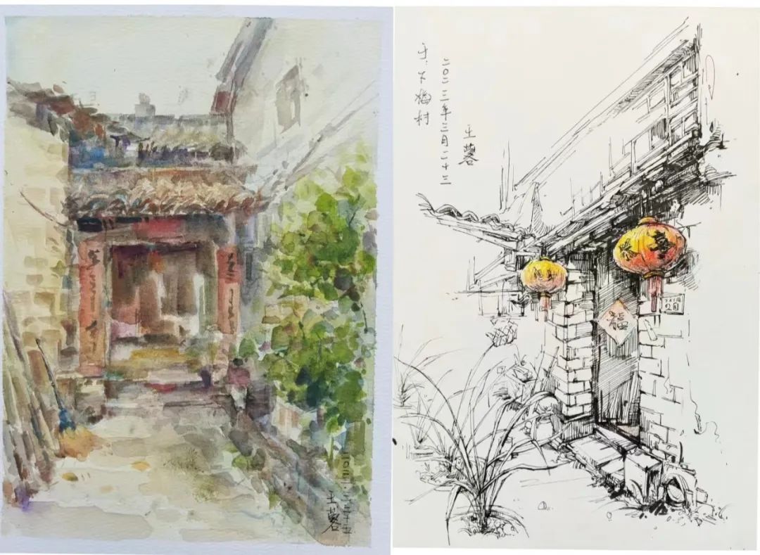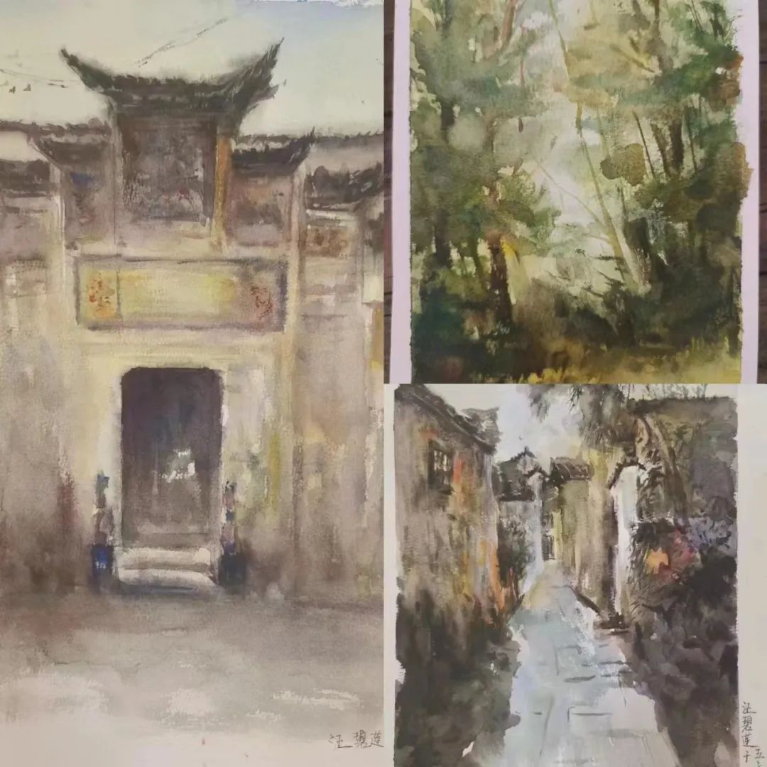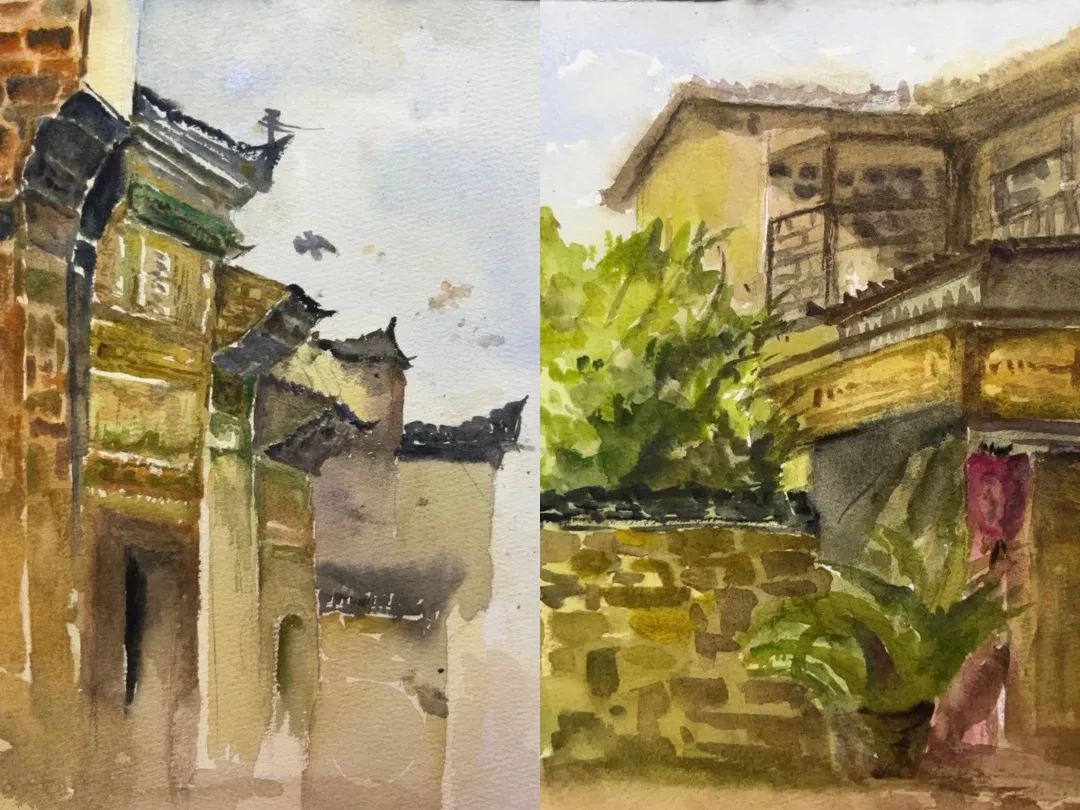 在这些曲折动人的街巷里,大家的灵感和热情也被激发,坐在小小的写生凳或是路旁的砖石上,手执铅笔,用简洁的明暗素描勾勒出建筑独特的光影和古老民居精致的梁柱檩枋;或是用硬笔,快速地描摹出层次分明、错落有致的木楼砖房;又或是以画笔带动丰富的色彩,将那白墙黛瓦、青砖褐土、翠叶黄花画下,将心中对风景的感悟尽诉纸上。