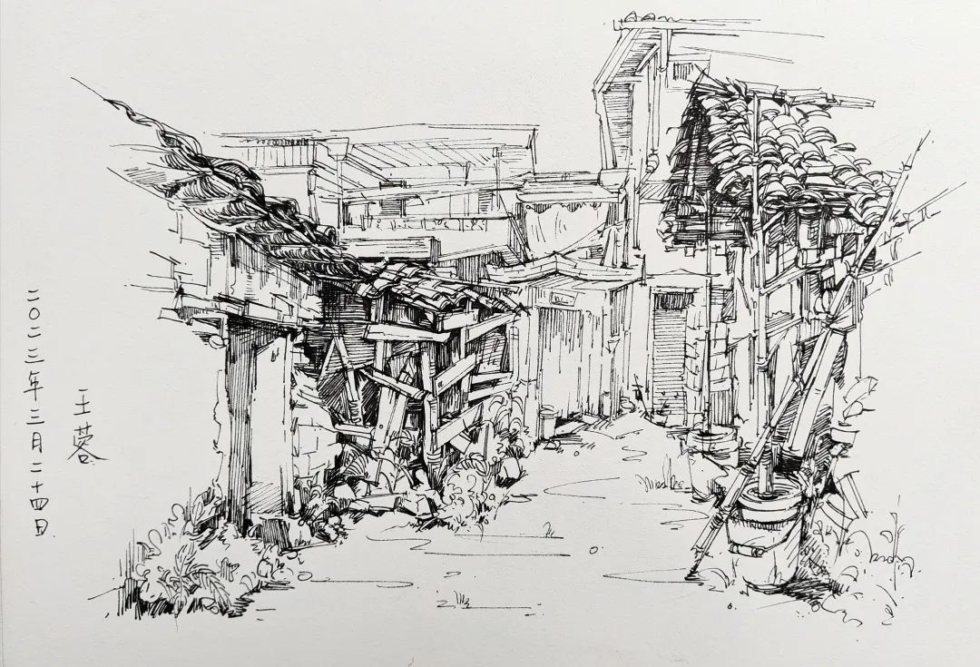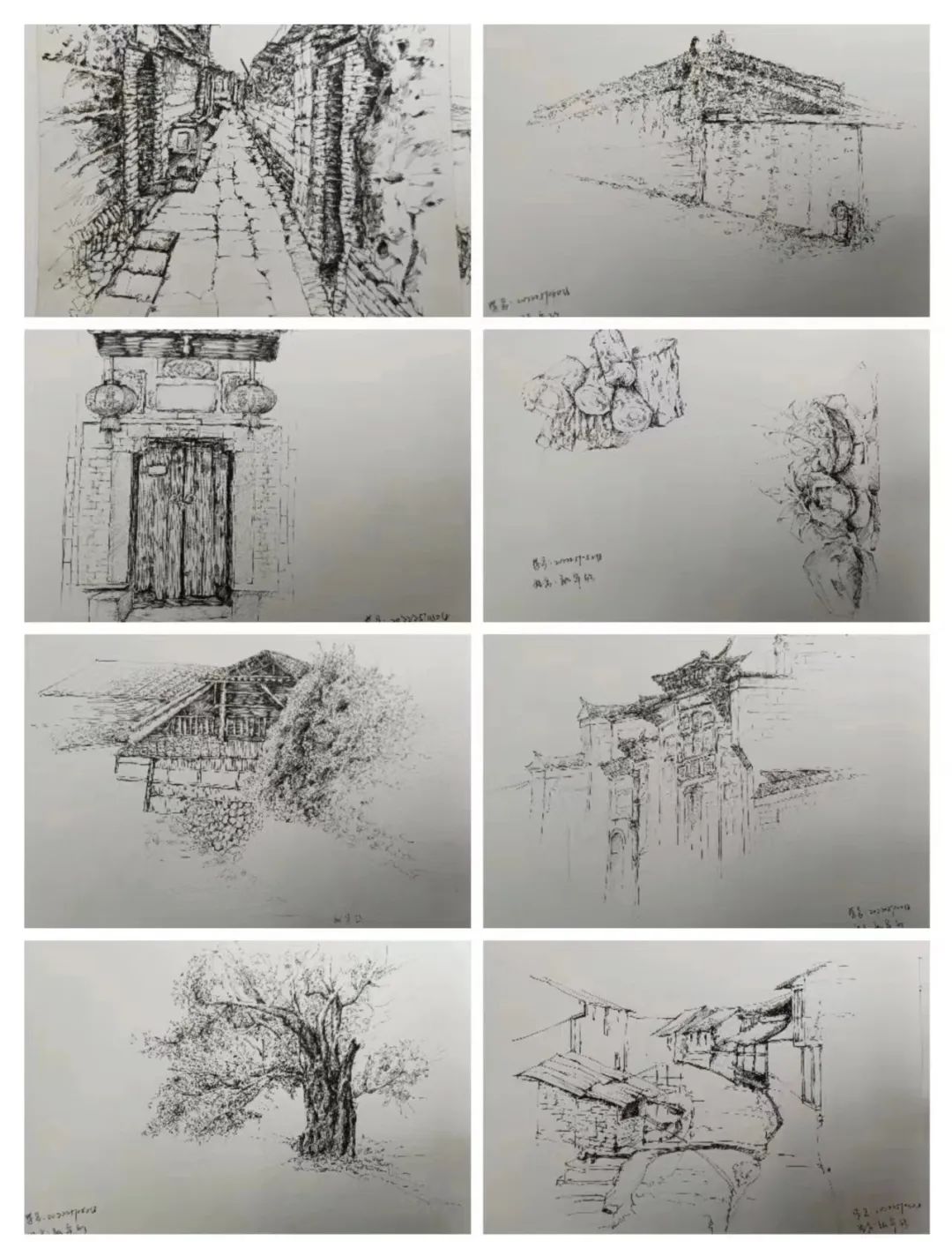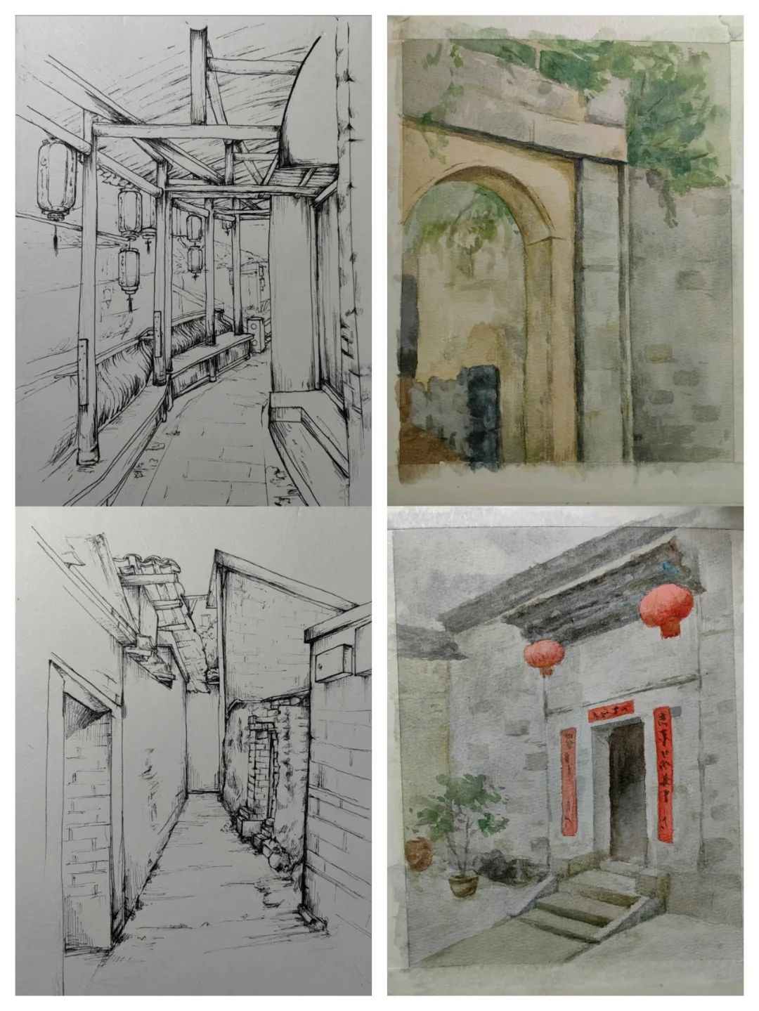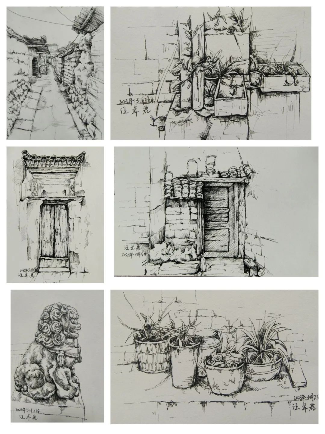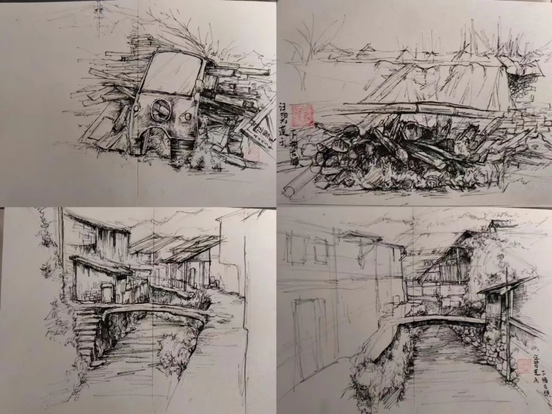 在这些曲折动人的街巷里,大家的灵感和热情也被激发,坐在小小的写生凳或是路旁的砖石上,手执铅笔,用简洁的明暗素描勾勒出建筑独特的光影和古老民居精致的梁柱檩枋;或是用硬笔,快速地描摹出层次分明、错落有致的木楼砖房;又或是以画笔带动丰富的色彩,将那白墙黛瓦、青砖褐土、翠叶黄花画下,将心中对风景的感悟尽诉纸上。