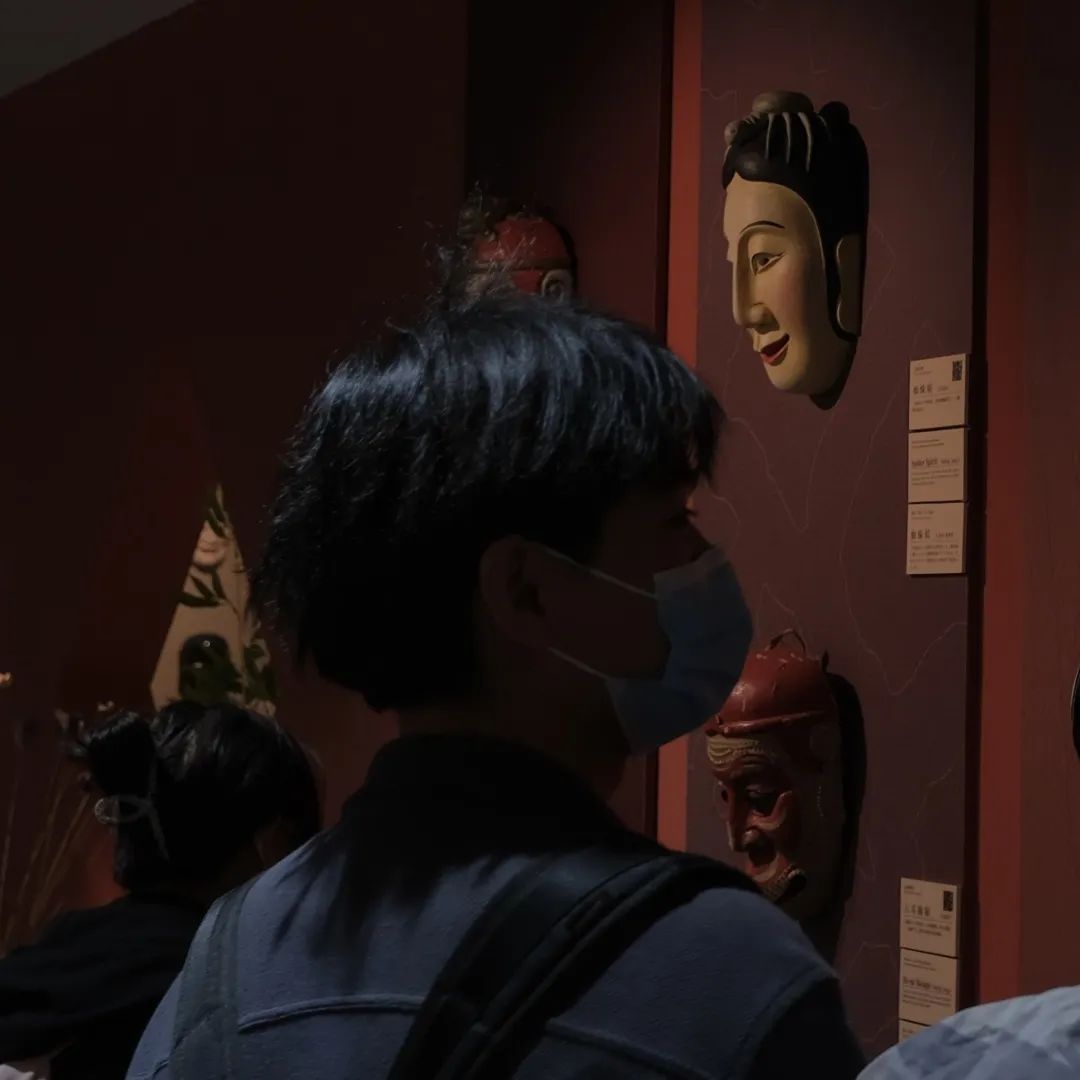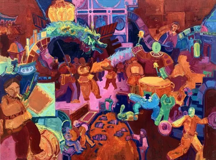 记忆中过年舞龙灯的场景热闹而拥挤,有放鞭炮的孩童,有敲锣打鼓的大人。右下角带着耳机的人手里提着兔子灯笼,虽然在这个热闹的氛围中显得格格不入,但是她的耳中心中依旧锣鼓震天响,她正提着灯笼在回忆里穿梭。
