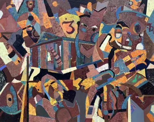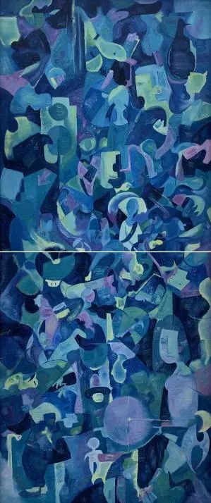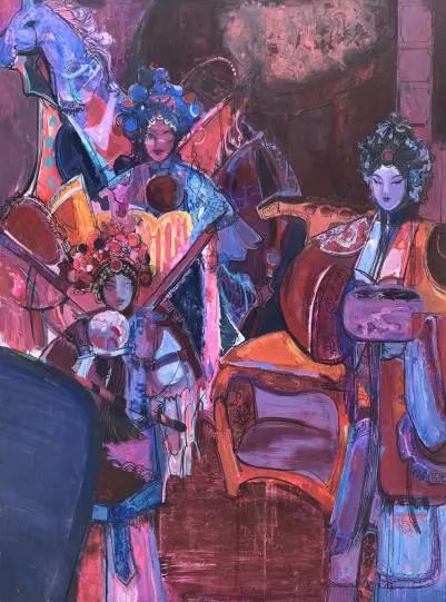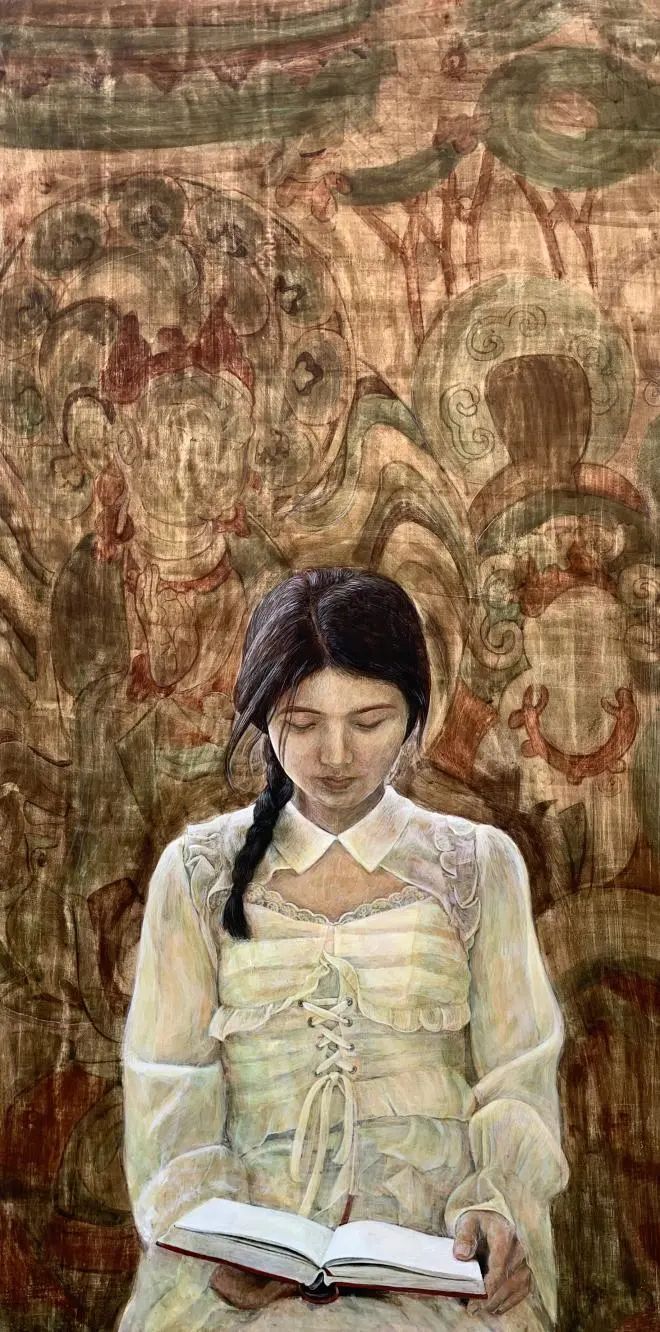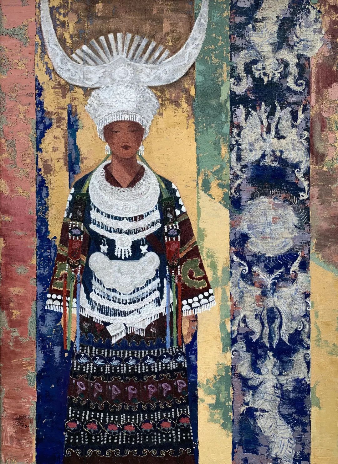 苗族服饰被喻为“穿在身上的史书”,作品表达在快时代经济发展和旅游业发展下,现代文化元素渗入,苗族传统服饰文化受到冲击和苗族传统服饰文化的迎合,作品融合了个人学习敦煌壁画,版画,岩彩画的主观意象,描绘出作品中的苗族文化的神秘感和氛围感,主要构建其画面的斑驳感,沉重感,体现出苗族文化元素不可再生的历史色彩。