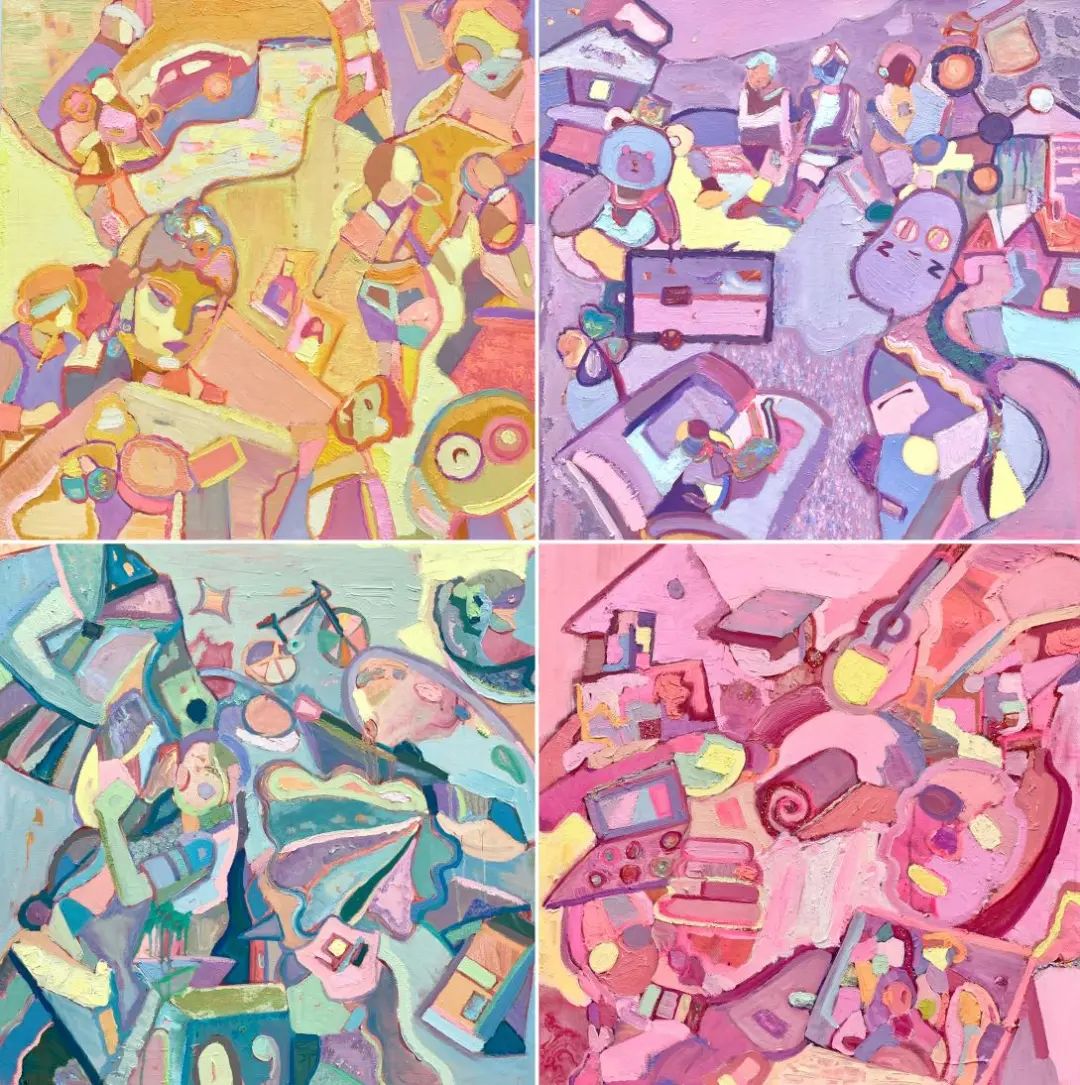 将客观复杂的事物凝练为点线面,把五颜六色的色彩归纳为主观色,在有限的物质平面中,对各种形式元素进行解构重置,红绿色彩与肌理的碰撞,展现定格各个时期的我。