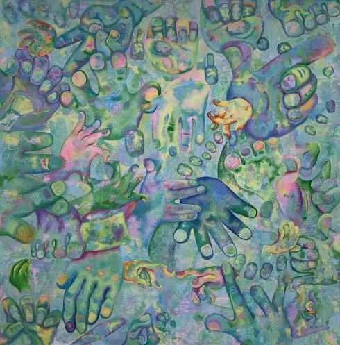 这幅画的创作灵感是有天我做了美甲,我觉得我的手好美,由此我开始把我的手画进我的画里。在色调上受新卡通风格的影响选择了以明亮的绿色为主调,这种色调给人以个性、光芒和丰富多彩的生活态度,象征着青春就是像这样多姿多彩、活力无限,就是要表现自我。