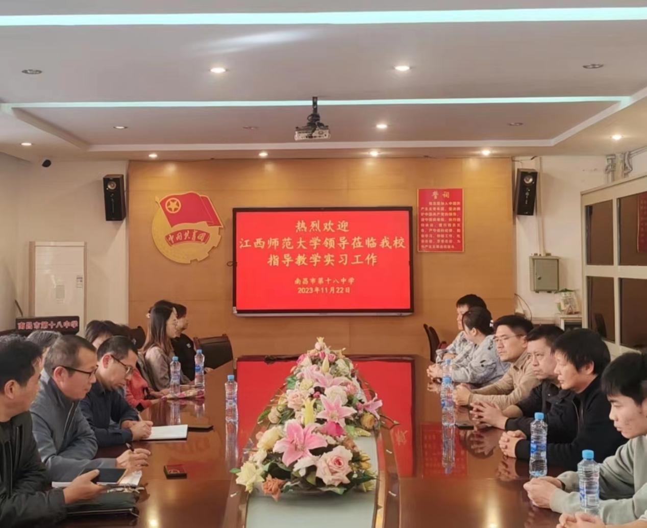 在南昌市第十八中学,学校对苏敉院长一行的到来高度重视,校长唐衍涛安排了专门座谈会并亲自主持,副校长李志强、美术教研室主任何雄发及相关指导教师出席了座谈会。座谈会上唐衍涛校长首先对我们学院学生能来他们学校实习表示欢迎,表示作为一所以艺术特长生培养为主的高中,他非常希望双方能深化合作,让师大华亿平台高水平的师资力量来帮助他们的教师提高美术专业水平,并表示今后一定会专程来我们学院商谈此事。美术教研室主任何雄发与所有指导学生的教师逐一发言,分别介绍了自己指导的实习生情况表现,一致对我院实习生的职业态度、专业能力及教学能力表示认可,尤其对张俊伟同学的表现、能力品行给予了高度评价。