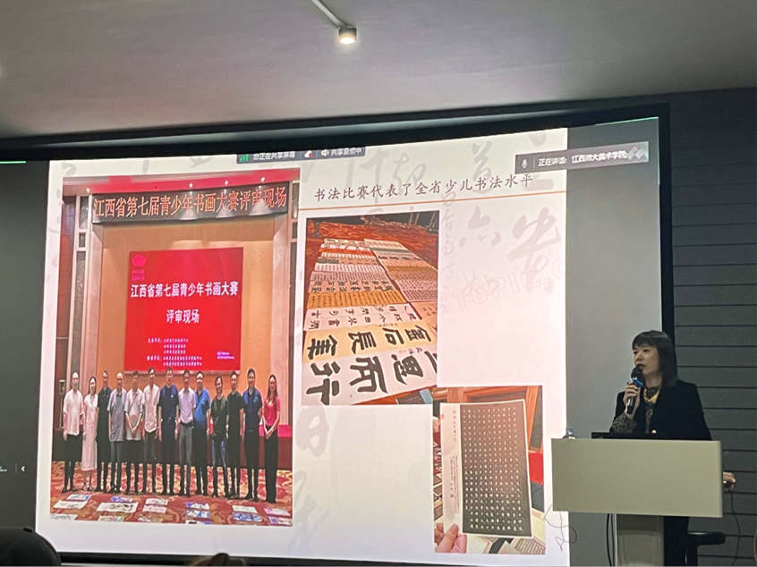 熊继萍老师的讲座以《半亩方塘写春秋——中小学书法教学那点事》为主题,从“就事论事、分内之事、事在人为、便宜行事和终身大事”等五个方面来探讨中小学的书法教学。在“就事论事”方面,熊老师站在同学们的立场,对中小学书法教学存在的一些疑问展开说明,激发了师生们好奇心;对于“份内之事”,熊老师提出,作为中小学教师的基本功要扎实,三笔字(硬笔、软笔、粉笔)要会写,会教,要和学生一样不断学习、不断进步;关于“事在人为”,熊老师选取了周围非常优秀的书法教育工作者,对他们的事迹进行分享,如“热爱书法的好校长郭鹏”。谈及“便宜行事”,熊老师告诉我们中小学兴趣班硬笔容易出效果,高中培养学生的软笔能丰富生活、培养学生的兴趣爱好。对于“终身大事”,熊老师认为“一事做十年就是专家,执笔定终身就是一种幸福!”最后,熊老师引用朱熹的《观书有感》鼓励大家。