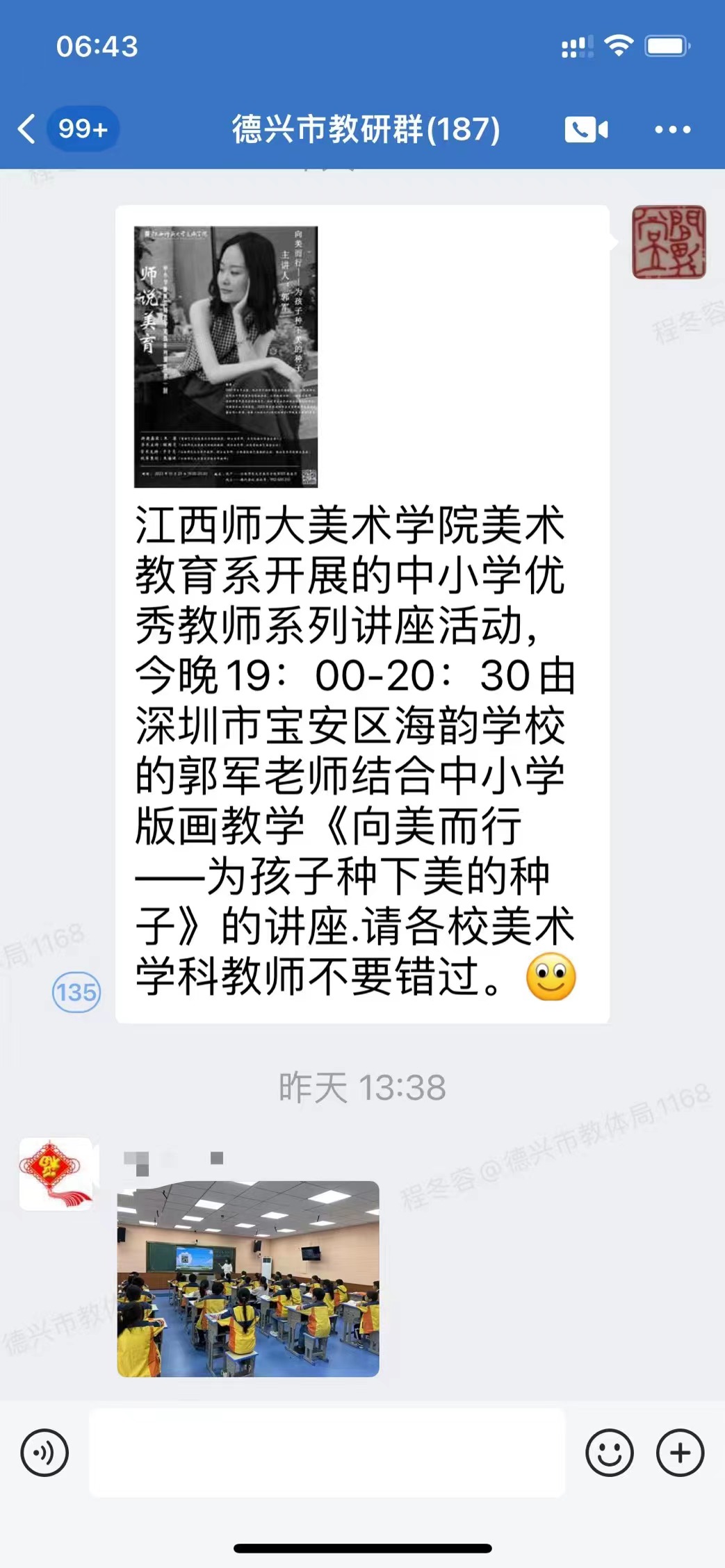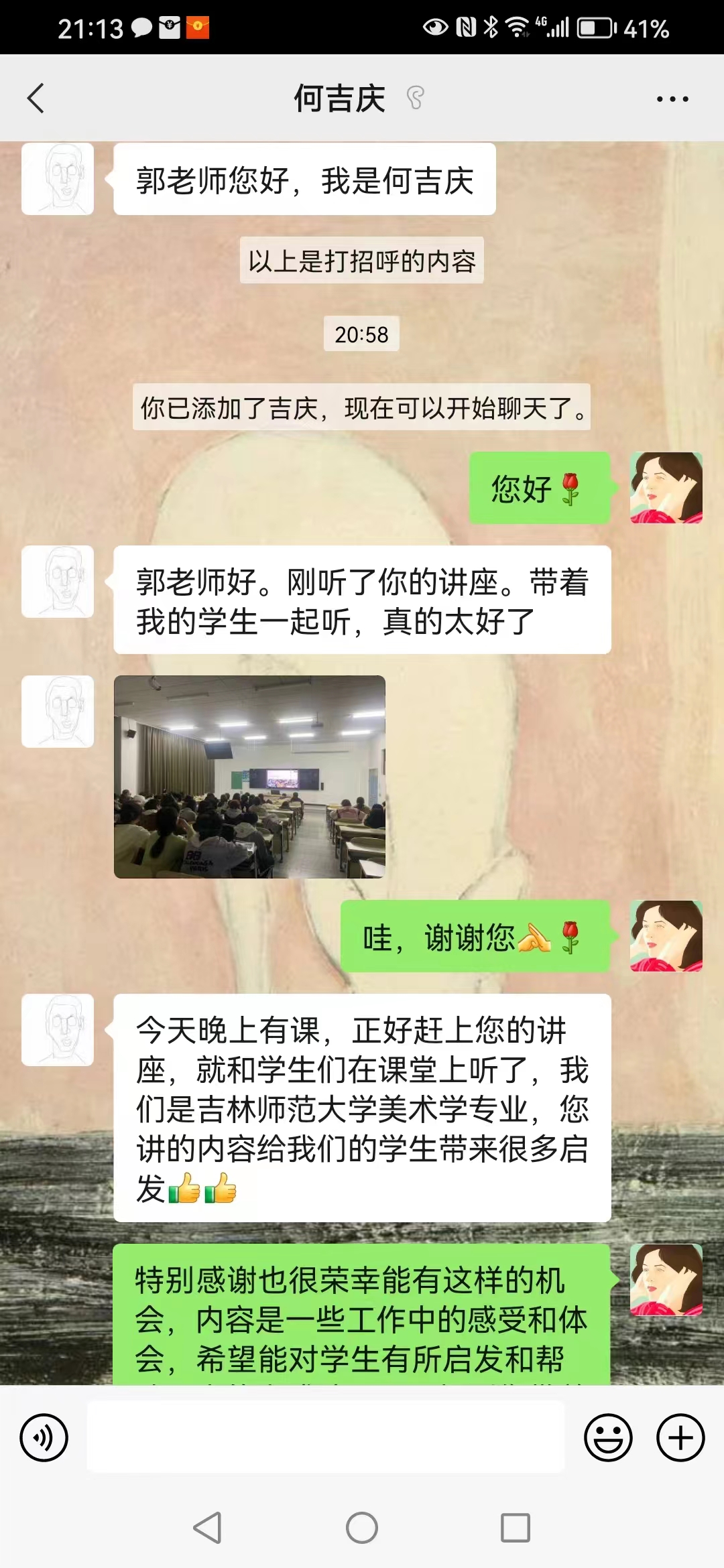 为扩大讲座的效益,两场讲座都通过腾讯会议对外进行直播,我院在外支教、实习不在学校的学生,部分县市美术教研室及高校美术教育专业组织师生专门听取了讲座,并一致对讲座给予了高度评价。