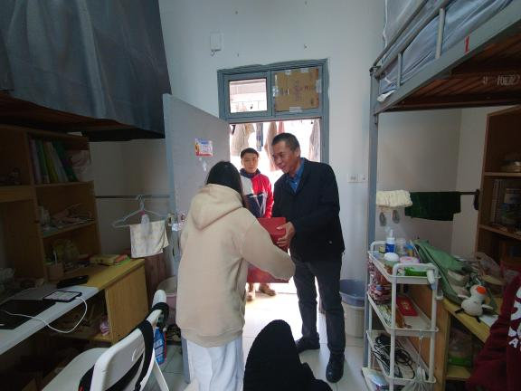 为避免困难学生羞怯情绪,熊吉生等院领导带领辅导员进行爱心物资的发放,将帮扶工作转变为师长的谆谆关怀,将学校和学院的爱生、护生精神手手相传,学院老师深入寝室逐一探访,避免帮扶工作疏漏,并送上抗寒物资。还向同学们详细介绍了学校、学院的各项资助政策,鼓励同学排除困难,放下包袱,专心致学。