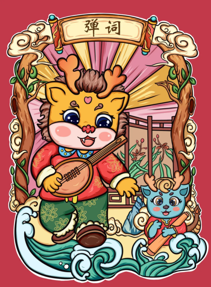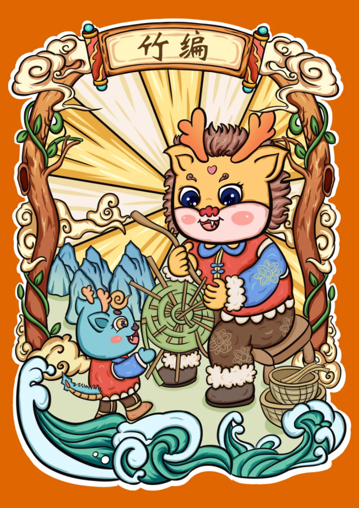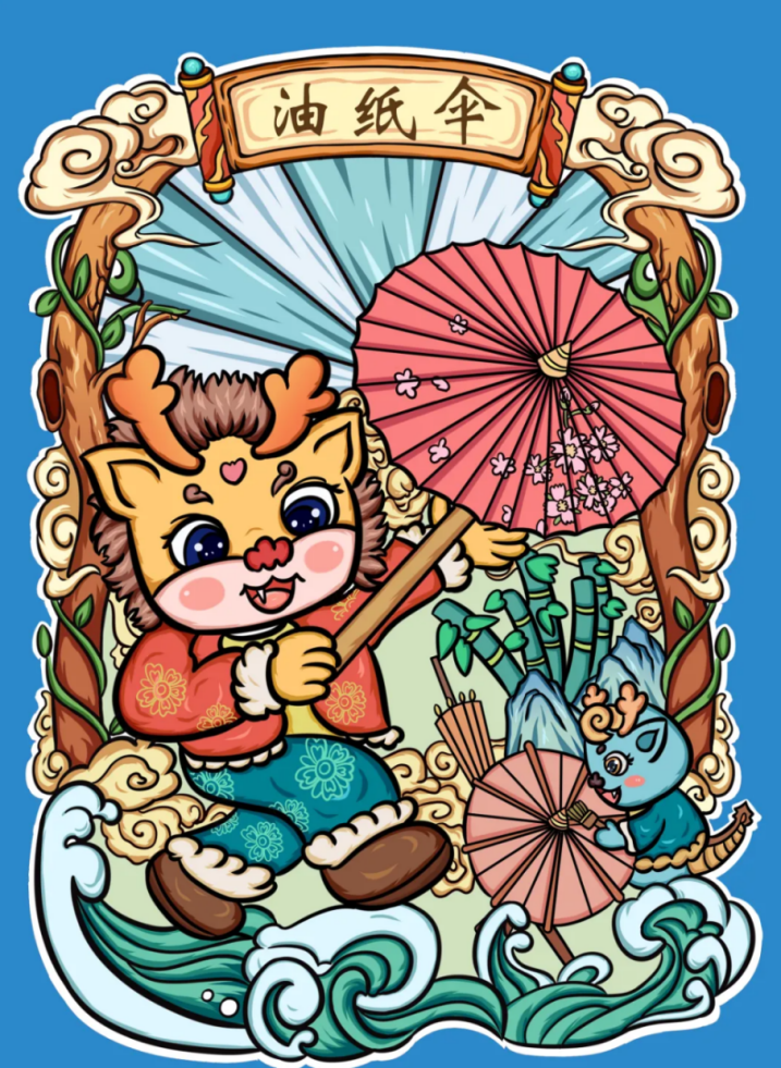 作品介绍:将十二生肖中的动物龙和我国传统非遗文化:油纸伞,弹词,竹编结合起来,制成一系列插画作品,来祝贺新年的到来,表达新年新气象,要有新的精神气去面对新年的到来。