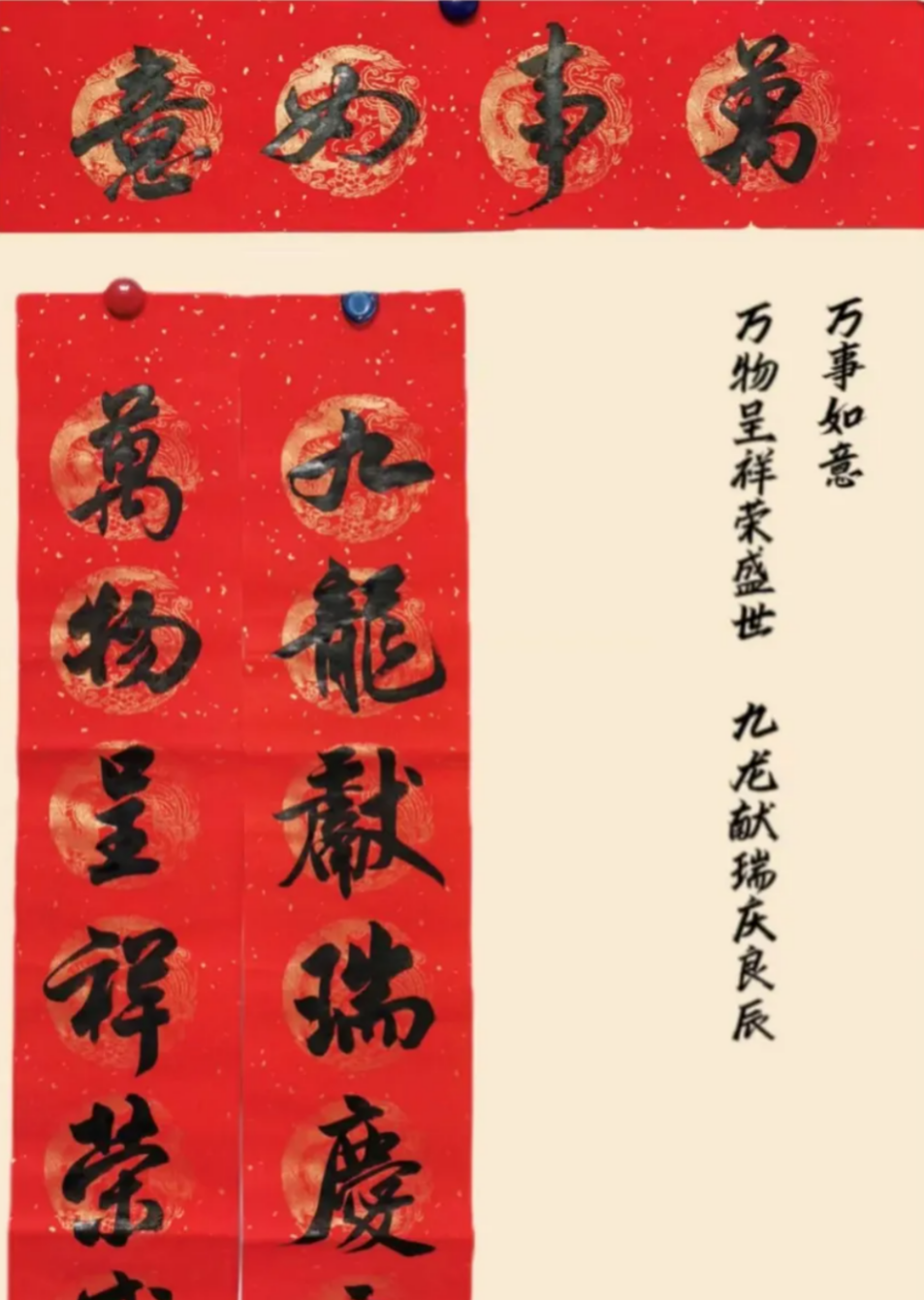 作品介绍:上联“万物呈祥荣盛世”,表达了大好时光中繁荣昌盛、万象更新的景象。下联“九龙献瑞庆良辰”,以九龙和瑞花为象征,传达了吉祥如意和幸福美好的祝愿。九龙是中国传统神话中的神兽,象征着皇权和吉祥,也象征着帝王的荣耀和国家的繁荣。瑞花则是中国传统文化中的吉祥符号,寓意着好运、幸福和和谐。整个句子通过九龙献上瑞花的形象,表达了幸福喜庆的时刻,祝愿人们在良辰之中获得吉祥、幸福和欢乐。