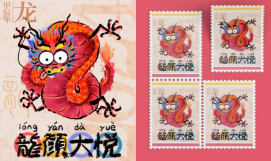 作品介绍:以“龙颜大悦”为主题,以传统绘画为基础,将龙形象与现代审美相结合,改变传统龙形象,设计出更加可爱、有趣、亲切的龙,并将其制作成邮票,将“希望大家可以天天开心,无忧无虑”的美好祝愿寄托其中,赠与亲朋好友。