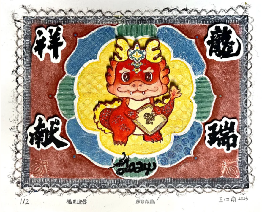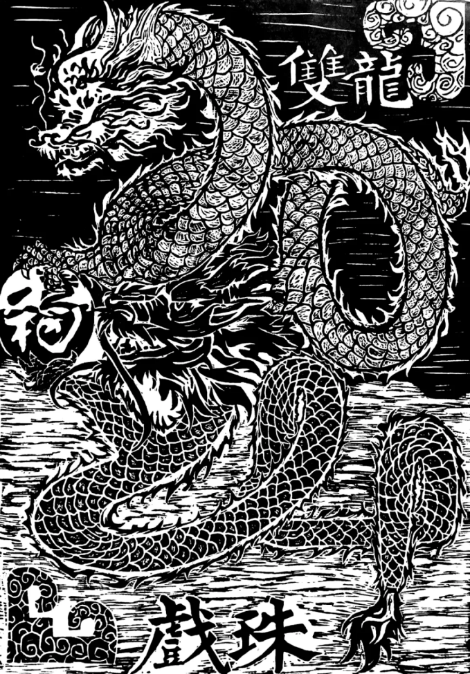 作品介绍:我利用古代的传说故事“双龙戏珠”,将这个富有象征意义的成语,融入画面,摆成2024字样,上下通过不同的刻画形式形成黑白对比,各有穿插,珠内用龙的简型写福,古典纹样分布对角,将油印黑白木刻版画的形式拓印在纸上呈现,通过两条龙对玉珠的争夺,象征着人们对美好生活的追求。寄希望在新的一年,在大环境下大家可以互相竞争、相互交融、万事顺意、好运连连、共同创造出卓越成果。